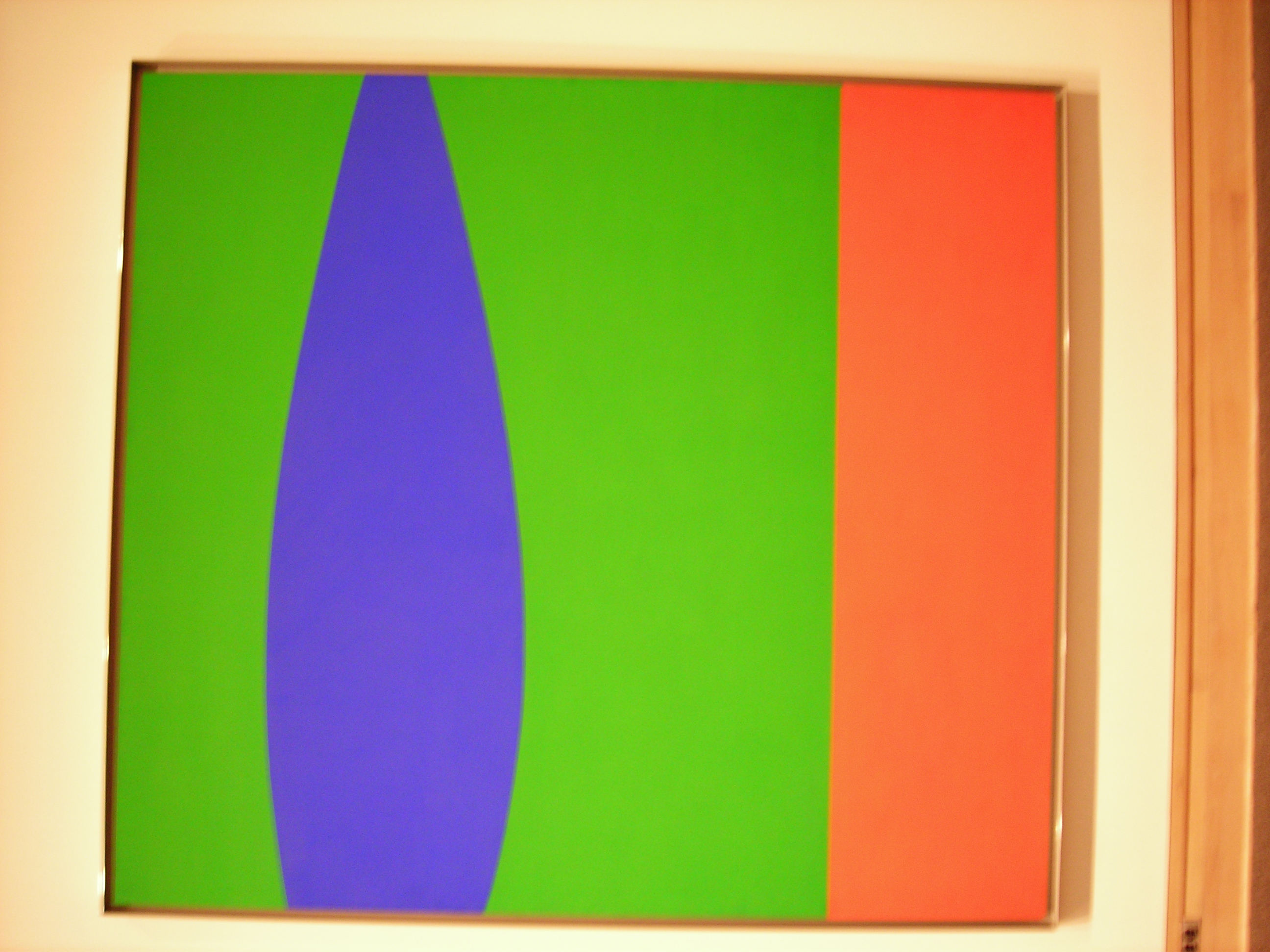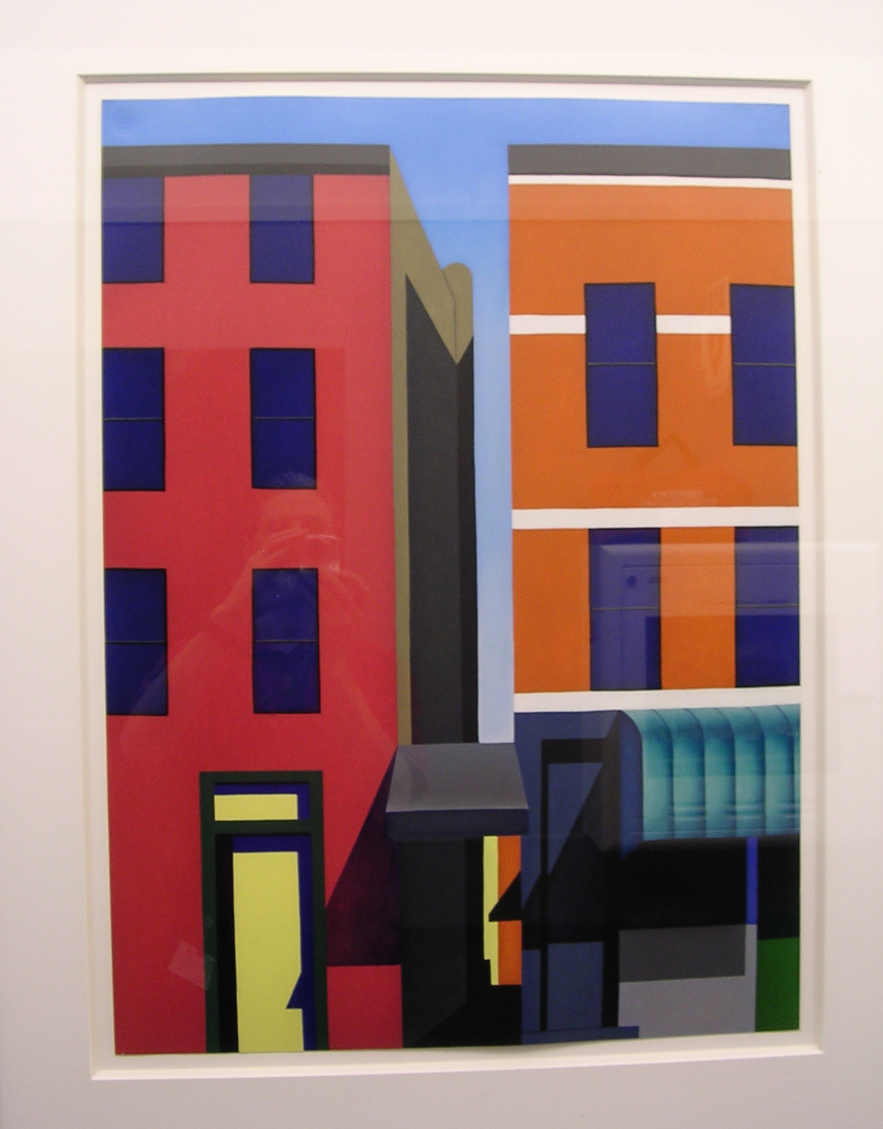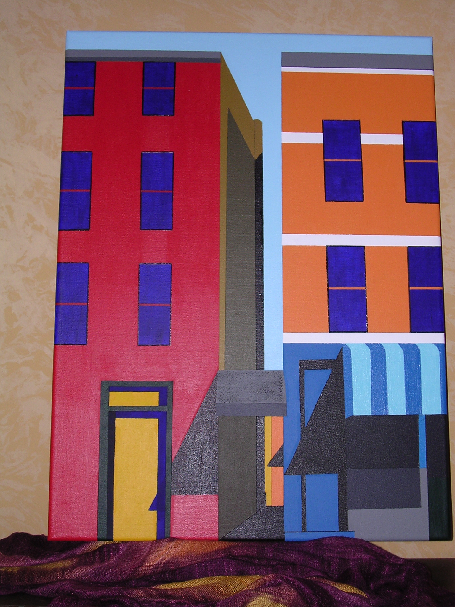 My first attempt at creating art grew from an appreciation for a painting I passed daily at work on my way to the cafeteria. I was drawn to a modern painting of a couple of buildings. Maybe this was a resurfacing of my adolescent love for architecture. I admired the interesting colors and the straight lines and I thought, “I could do that” and I am going to try. I knew aspiring artists often developed their skills painting other artist’s paintings. But I knew I couldn’t sit in the hall at work all day attempting to paint this painting. So I took a digital photo of it and took it home. You can even see a reflection of me in the glass.