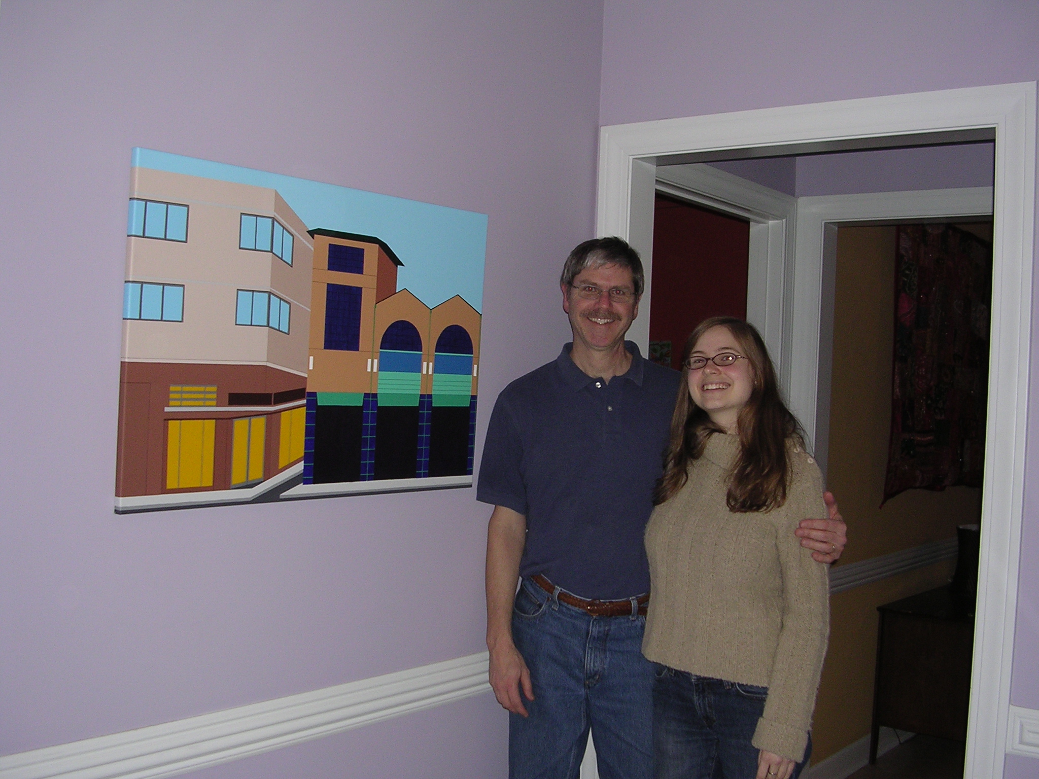That November, my daughter was able to come home for Thanksgiving. This gave me the opportunity to give it to her as a late birthday present. I wish I could have captured her expression on film when she saw it for the first time, I can just picture the glee. We snapped this picture of it hanging in our entry hall later. Knowing that she would have to take it back on the plane, I engineered and built a wooden case with handle that just fit the painting. I was struck when I finished the case and realized this was just like a real work of art, one so valuable that it required its own custom carrying case.