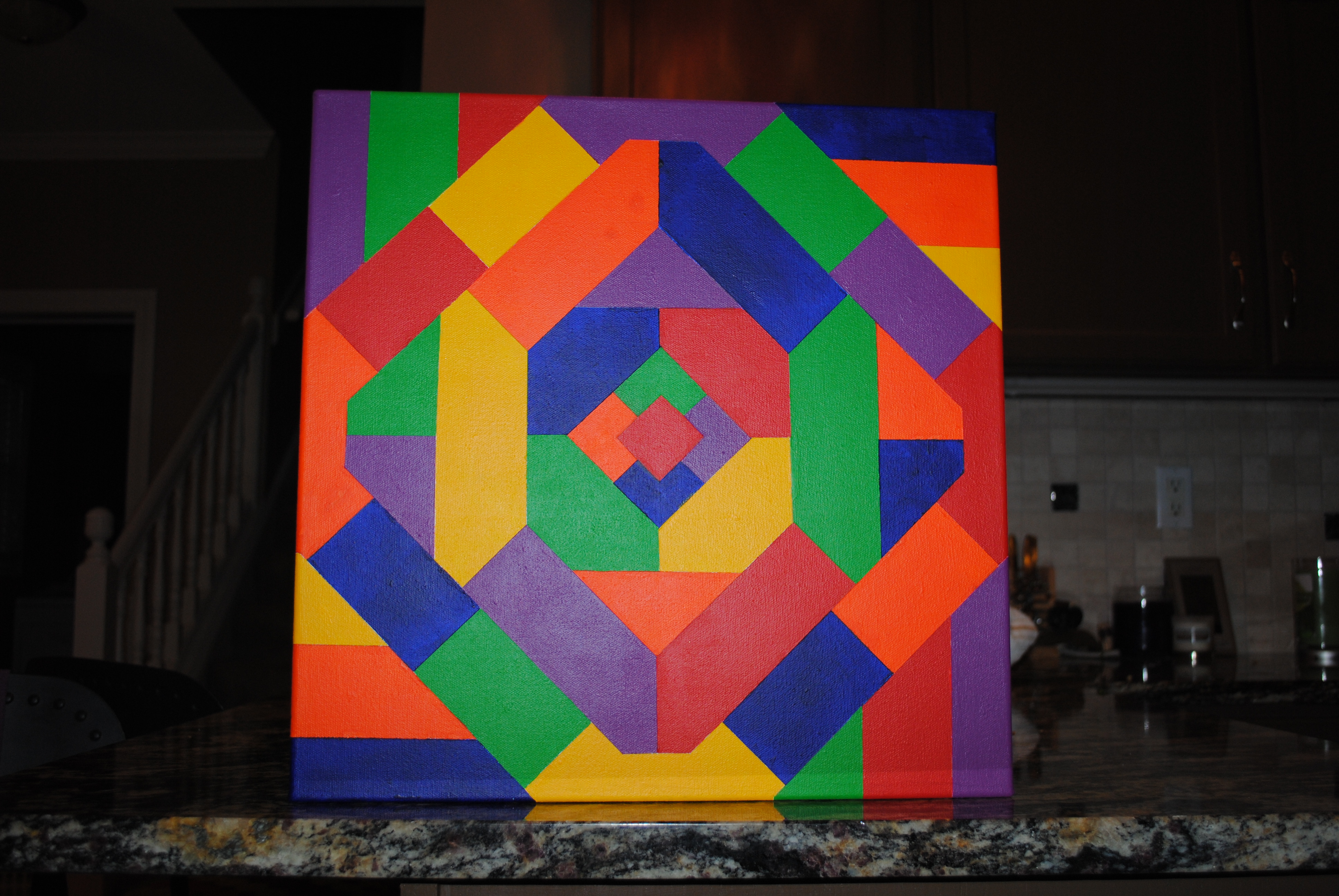 When I found the photo, I printed it out and continued to stare at it. It seemed to stare back at me taunting me. And then it hit me. Rather than trying to reproduce the design in my painting, I would create a design of my own using straight lines. I also realized that this would be much easier to paint than any of my building paintings: very few lines and no details. I jumped into the project and in no time was finished. It was hung in our kitchen, just weeks before we had a house full of guests in town for our daughter’s wedding.
