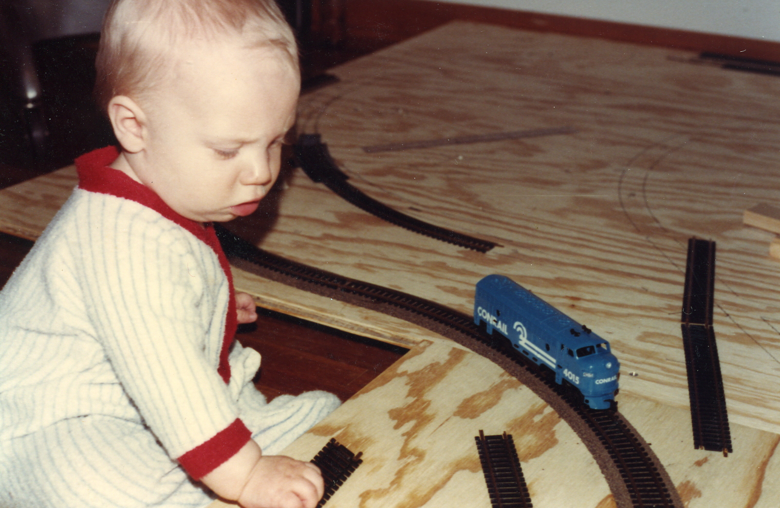 I must have been delusional to think that this would be a good idea but without much forethought I proceeded to buy a 4 X 8 foot sheet of plywood, the standard starting material for any beginning railroader.  I cut a 2-foot section off and attached it to the side to make an “L” shape for interest and began laying track on it.   Having bought an HO scale train and a few cars, I was ready to roll.  But before I knew it, our son had climbed out of his baby bed and was sitting next to the train track with the train in his hand getting ready to put it in his mouth.  The realization that this was not a good idea finally hit me so up in the attic the train layout went never to see the light of day again.