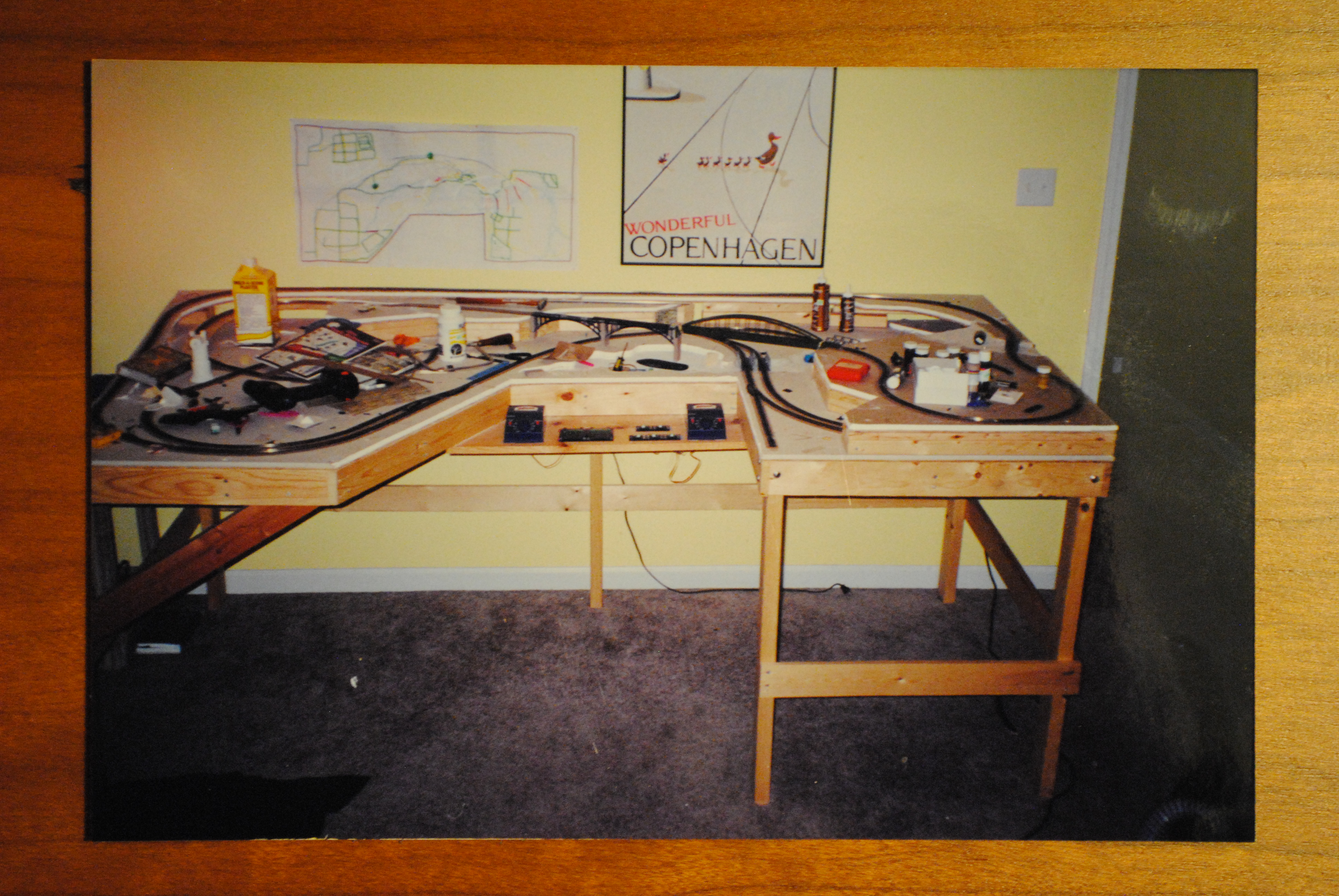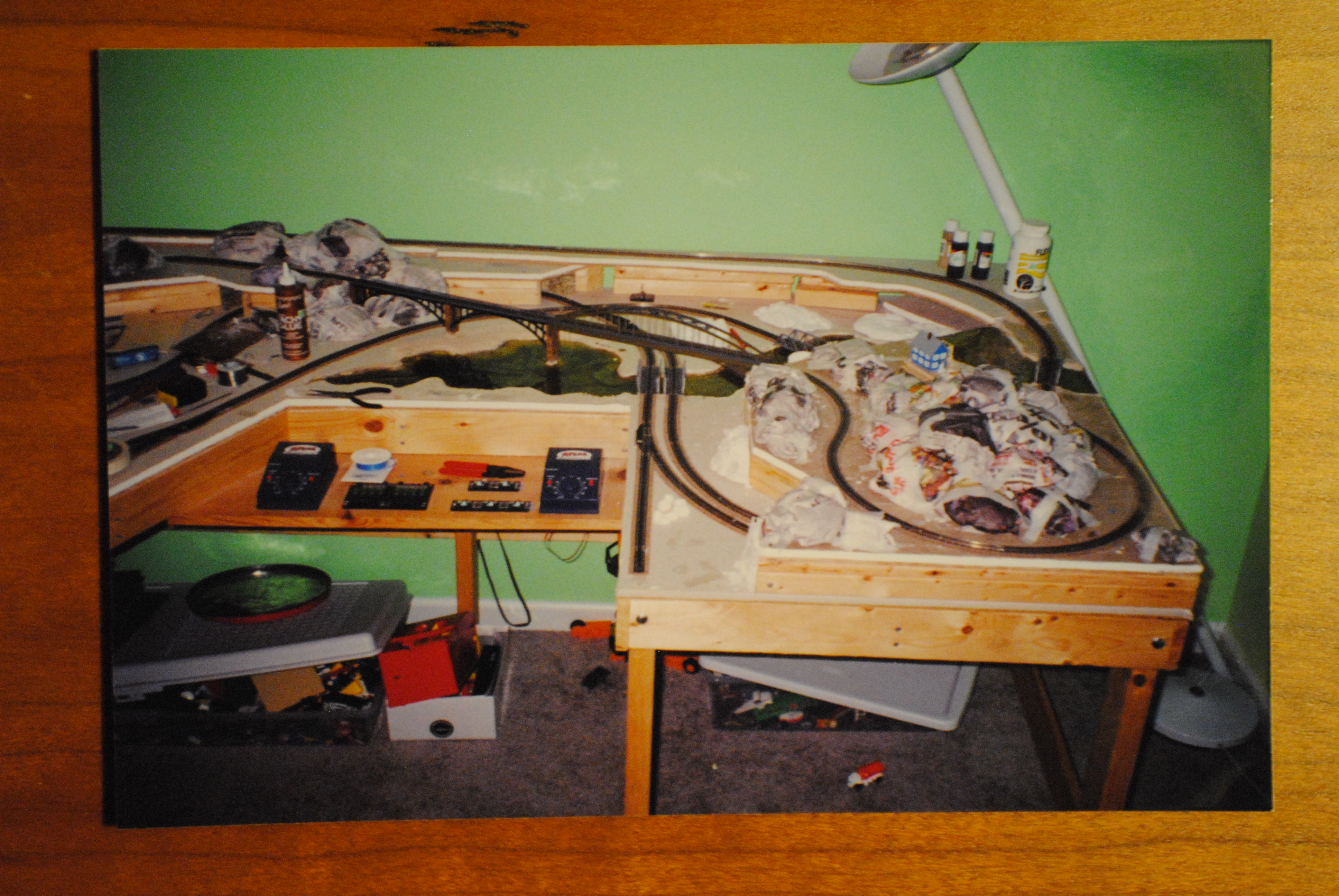 Having grown comfortable with having toy models as an adult, I decided it was time to revisit my love of railroads.  When our oldest kids were in high school and soon off to college, we bought a larger home that had a huge playroom.  Finally I thought we had a space of the scale necessary to build a “real train layout.”  Since our two boys were old enough to participate, we all joined in the adventure.  We came up with a design together and began.  We started by building a table that we attached a 4 X 8 piece of sheetrock to for the base of the layout.  We chose to work in “N” scale, which was smaller than the “HO” scale I had attempted before since it would give us more track mileage in the same amount of space.
