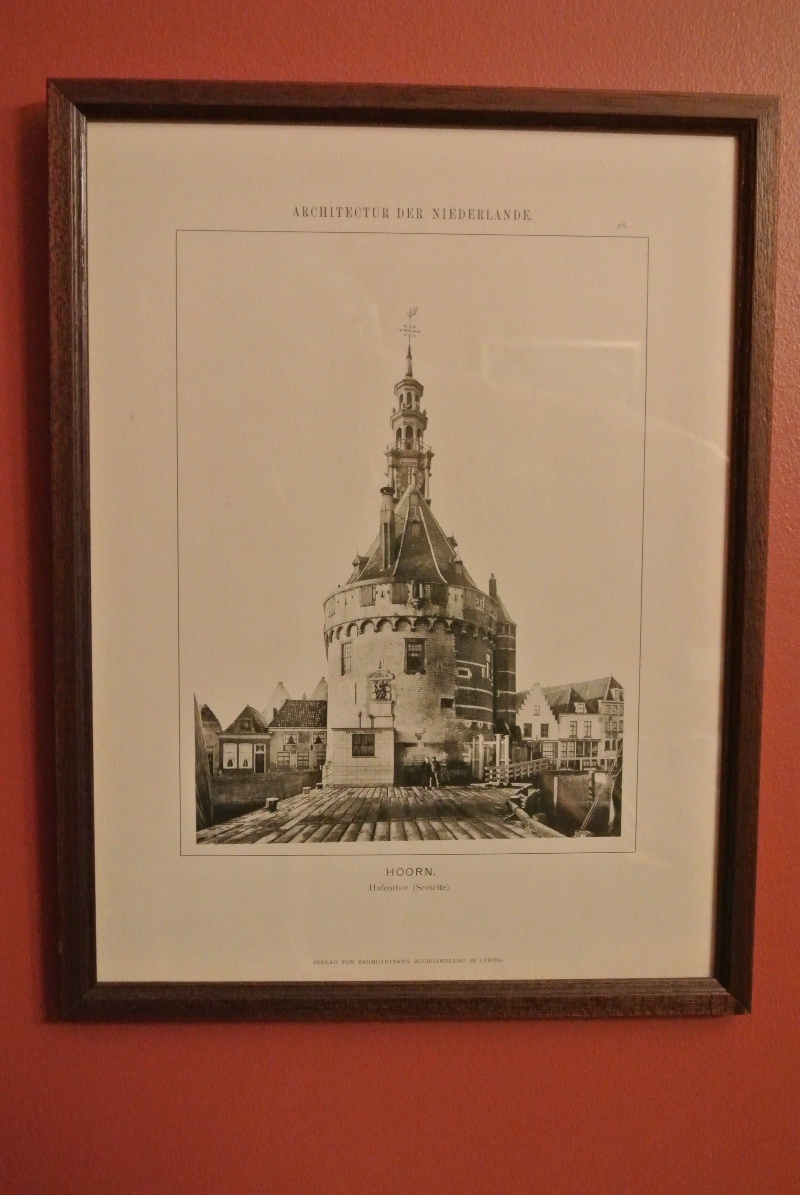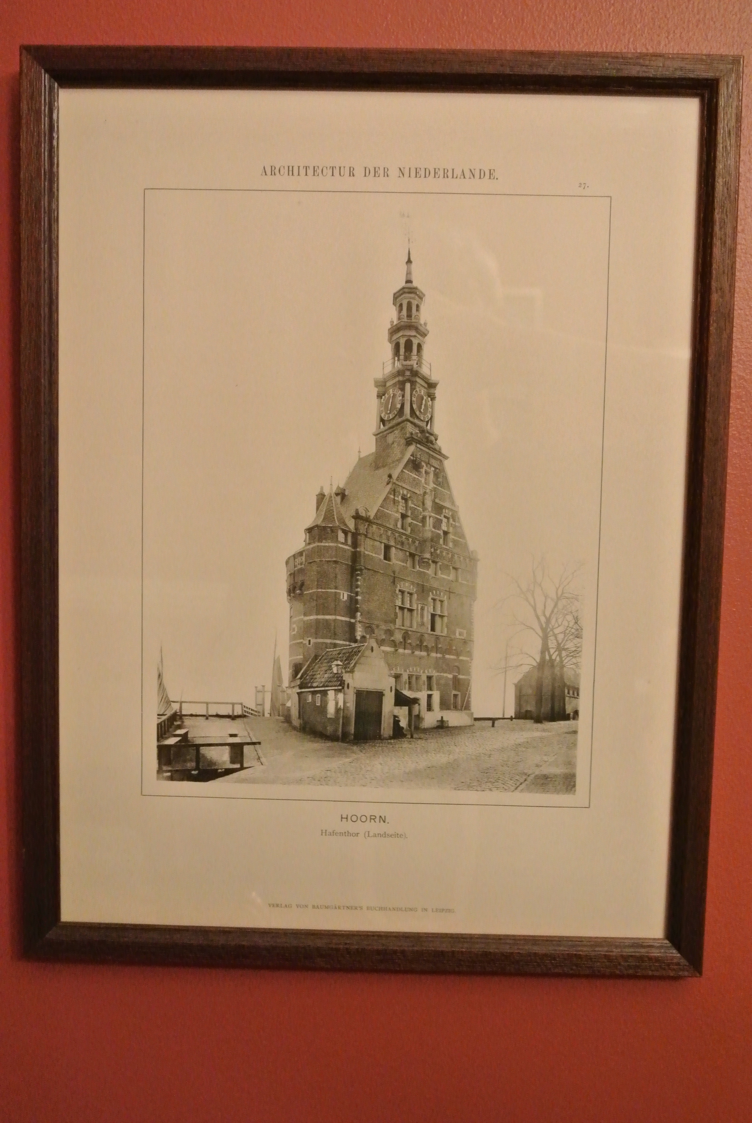 This story began several years ago when my oldest son gave me a print of a building in Hoorn, Netherlands for my birthday. It was an unusually shaped building, round on one side, constructed of several materials and topped with a clock tower. Based on the attire of two gentlemen in front of the building, it appeared to have been photographed sometime in the early 1900s.