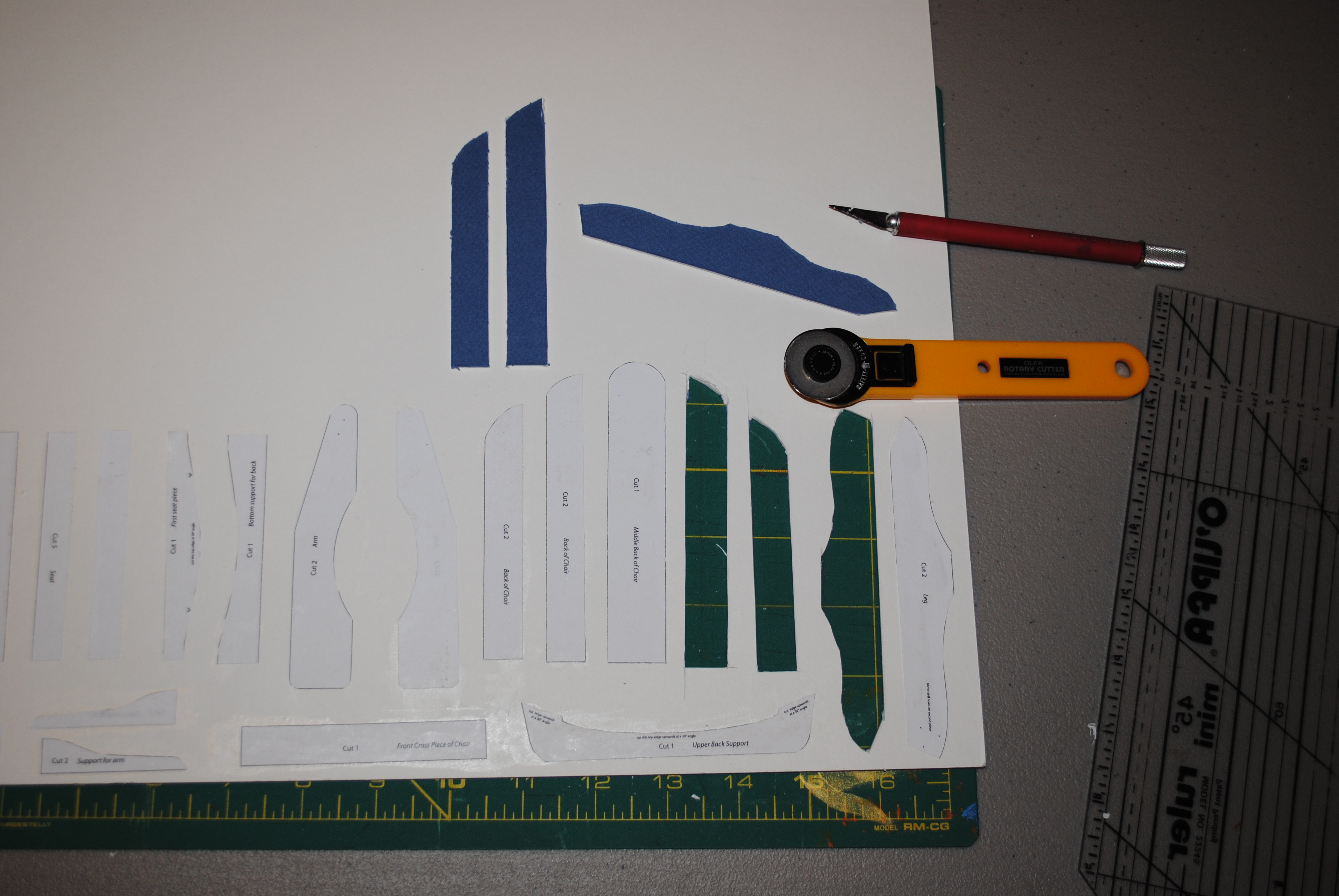 I next proceeded to carefully cut out each piece of the chair with a pair of scissors. I made two photocopies of each page since a number of parts required two or more pieces. Once I had all of the paper pieces cut out, I then glued them to the back of the mat board. A wallpaper roller came in handy for gluing the paper templates to the mat board.
