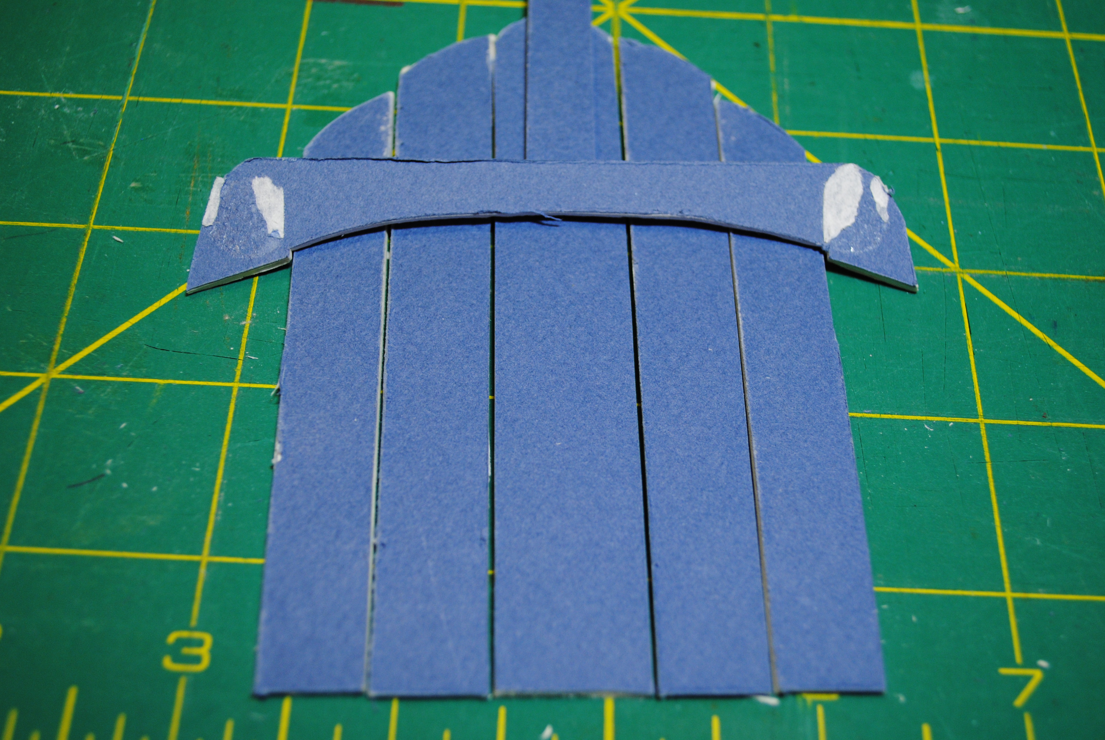 Somewhere in my reductions, cutting the paper templates, and cutting the mat board templates, my back pieces had grown to the point that even butted against each other, the spacing between the arms was still about ¼” too narrow. The scientist in me wanted to research what happened but fortunately the practical side of me said, “Don’t try to figure out why, just fix it.” So I narrowed each of the back pieces just a little. I started with the center back piece, and then moved to the other four pieces, just slicing a little off each side. This allowed the five pieces to fit nicely between the back brace with about the width of the pin between each back piece.