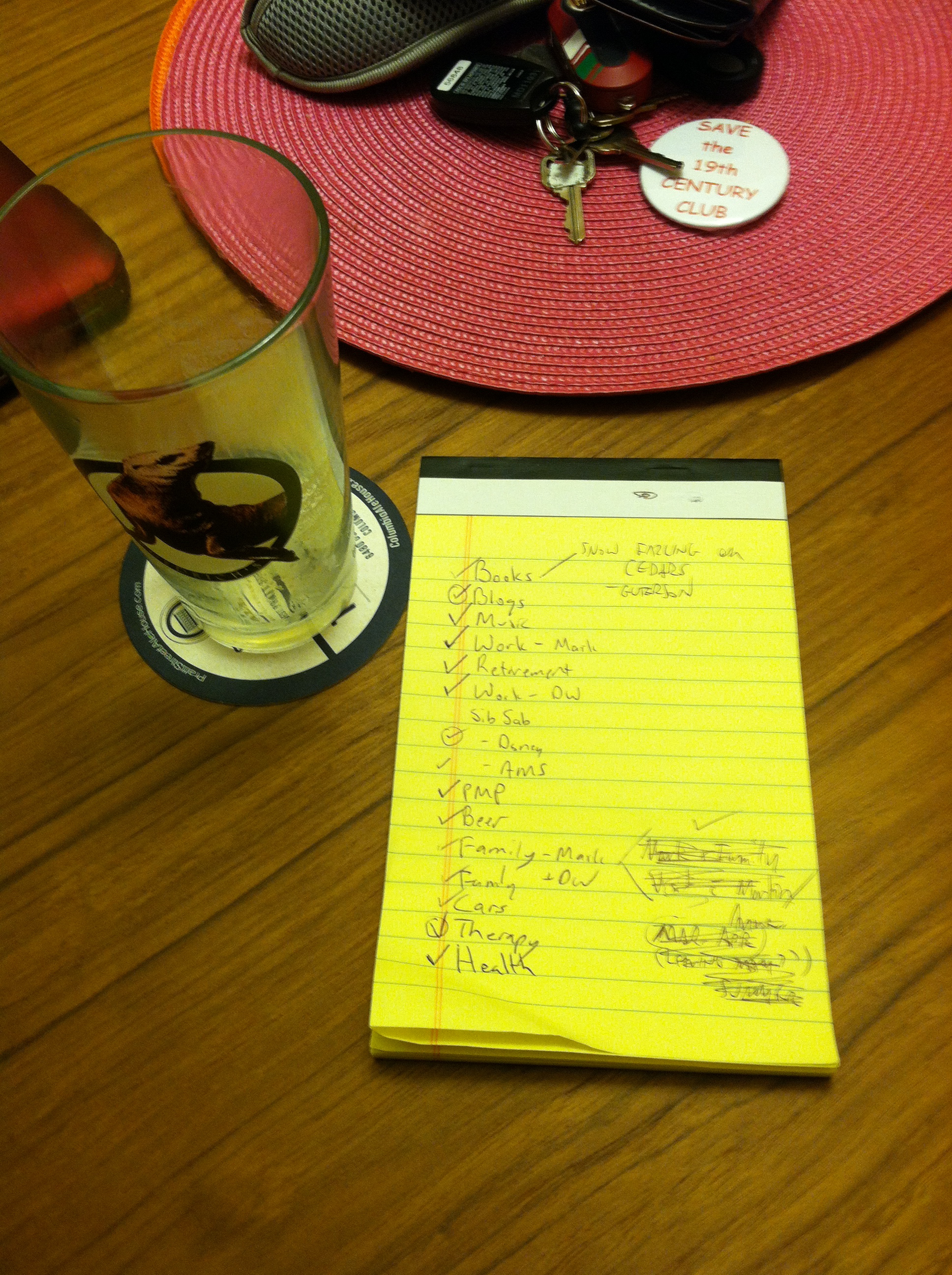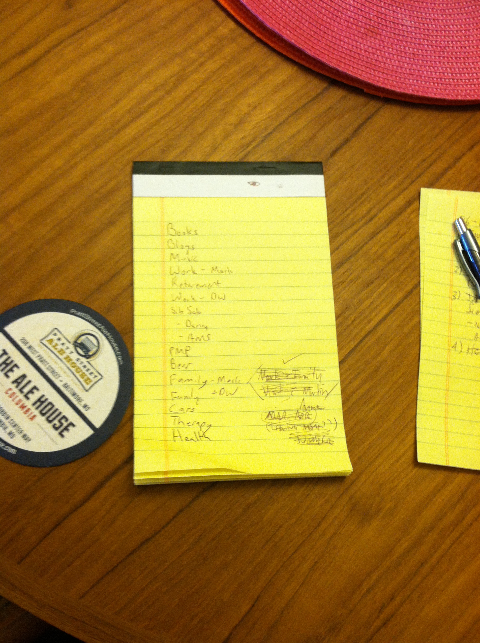 On Friday night I actually took this list with us to dinner so we could get started on our discussions (We later figured out I could take a picture of it on my phone so we wouldn’t have to carry the entire pad with us).