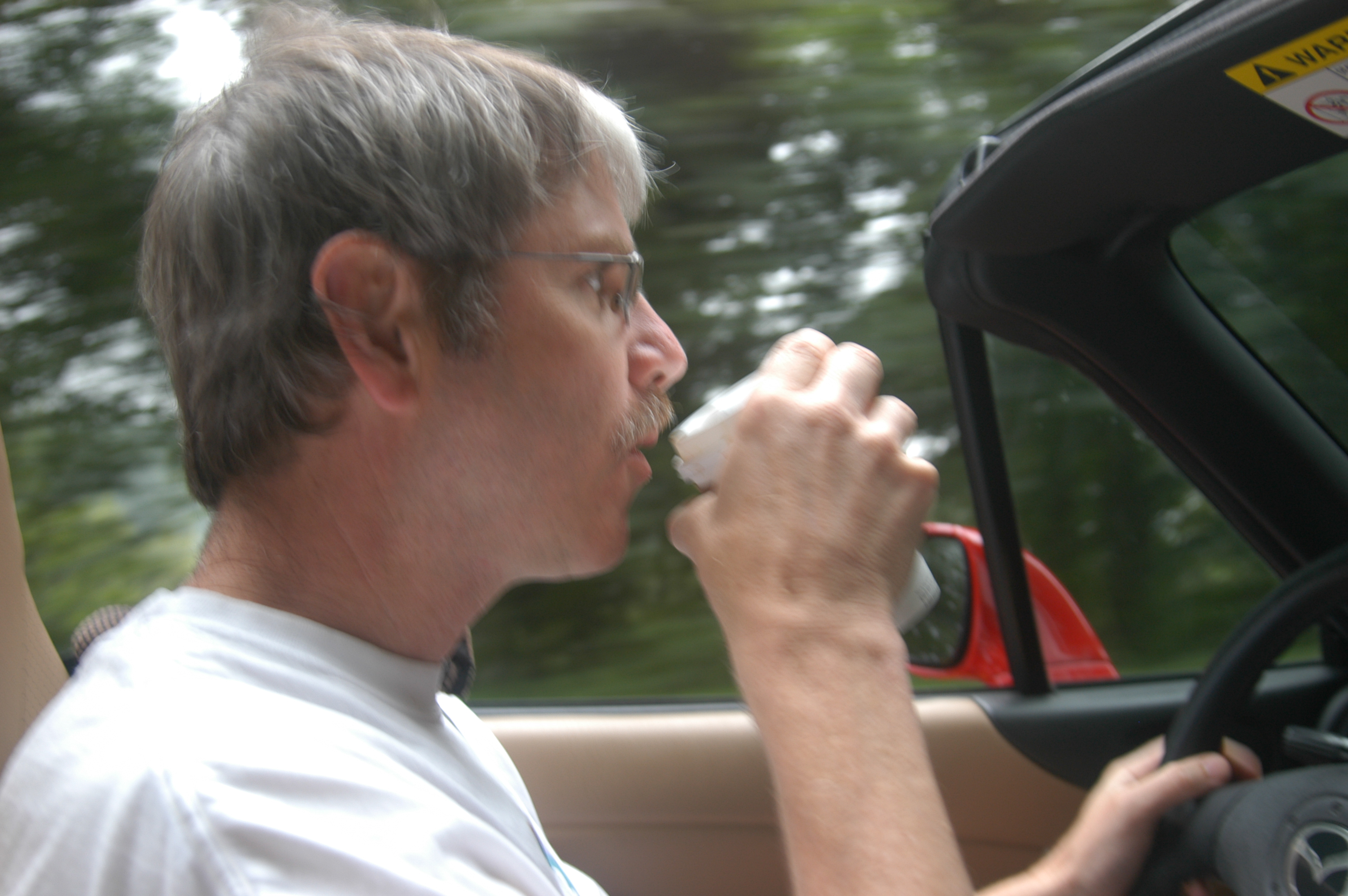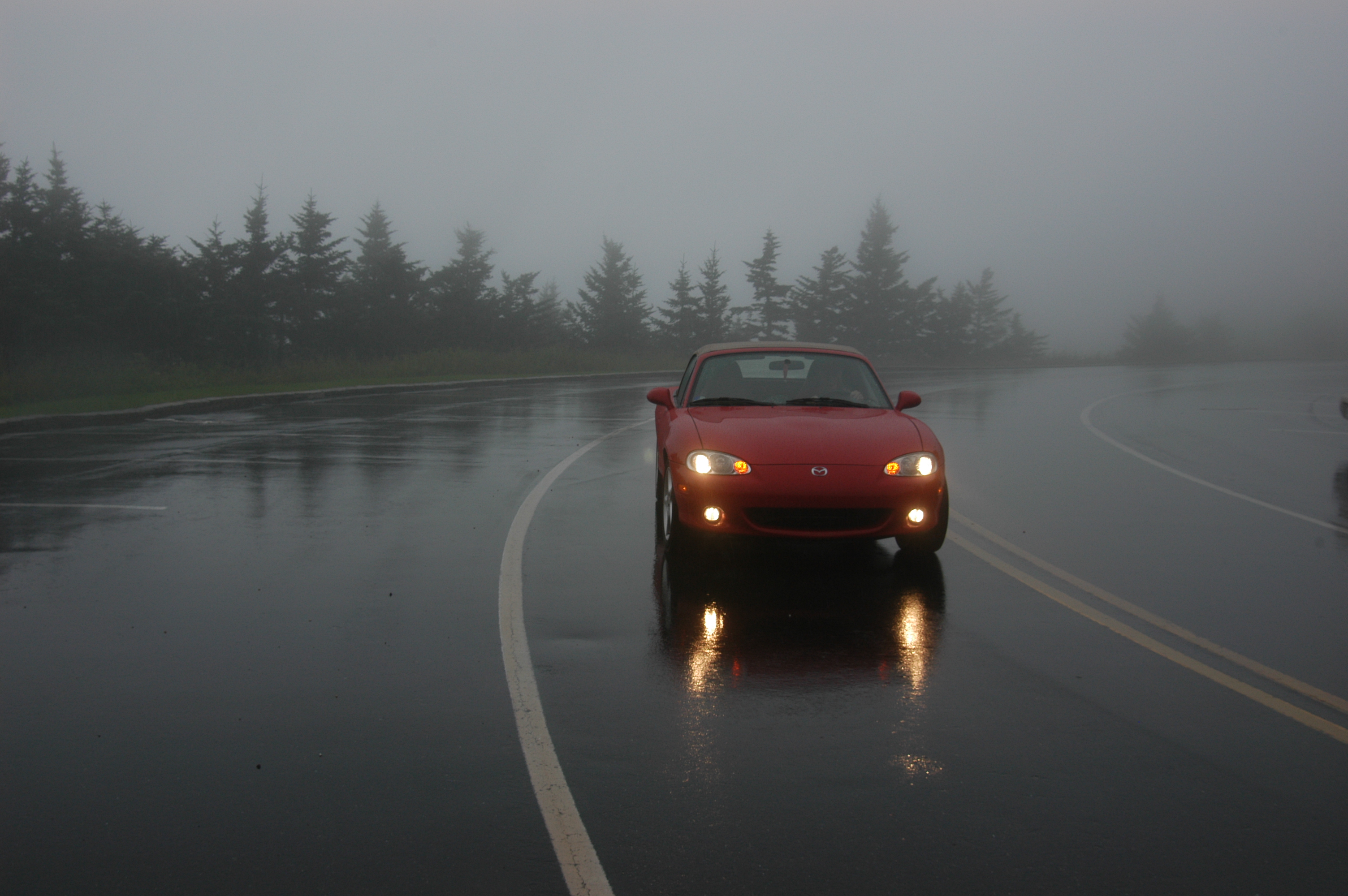 As we neared our ultimate destination, Mt. Mitchell—tallest mountain east of the Mississippi River and site of many cookouts growing up—the rain really began to come down and visibility was essentially nil as we were right in the middle of a rain cloud.  But my sister willingly braved the cold and rain to snap some shots of me in the car.