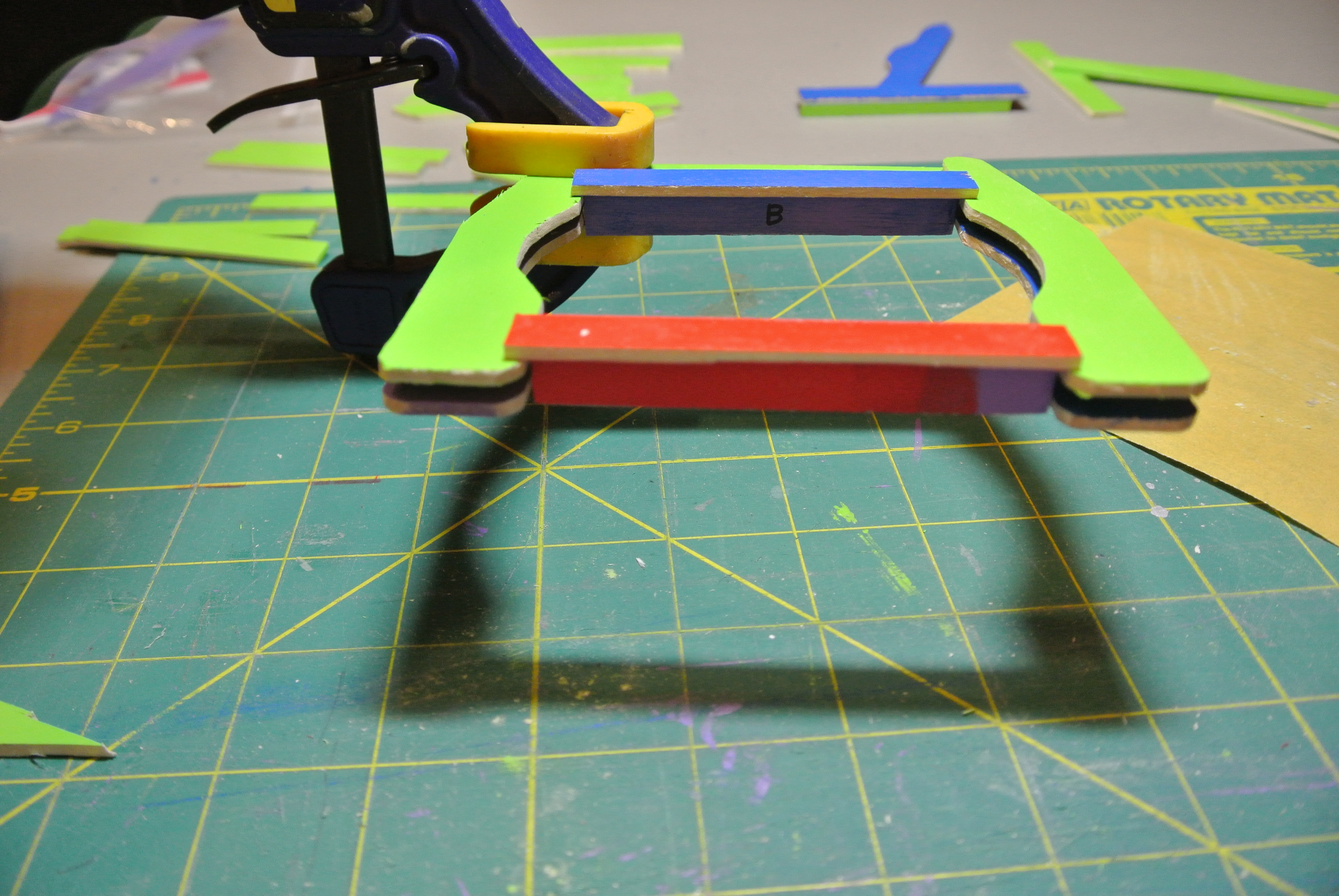 The second refinement was to make a second spacer to go with the spacer I had made previously. The two spacers could then be used when gluing the arm subassembly together.