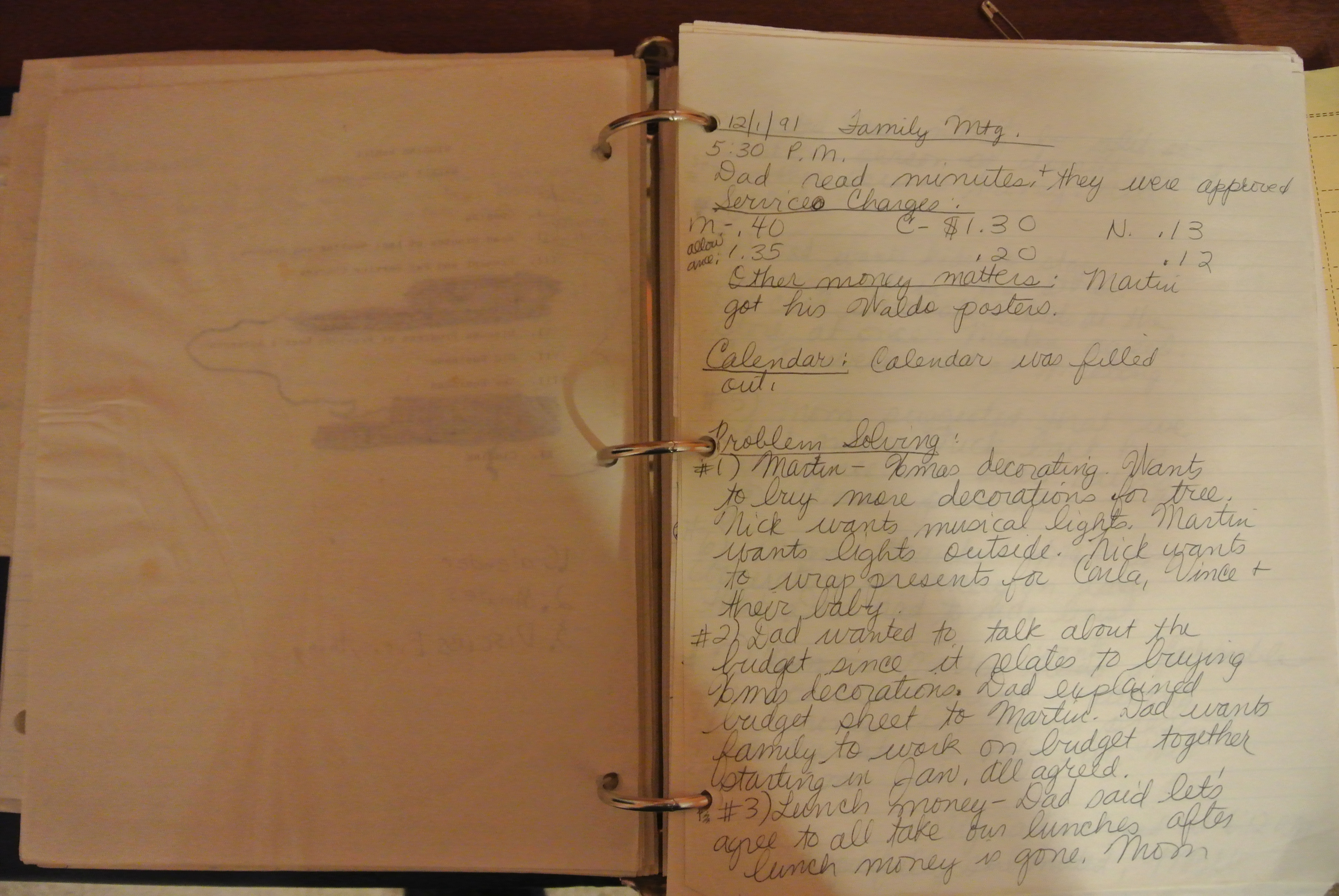 It was also my wife who introduced us to weekly family meetings where any number of items or issues was discussed and allowances were paid out. We still have the minutes from those meetings and on our 25th wedding anniversary; our kids went through them laughing with sheer delight at what was captured forever in those writings.