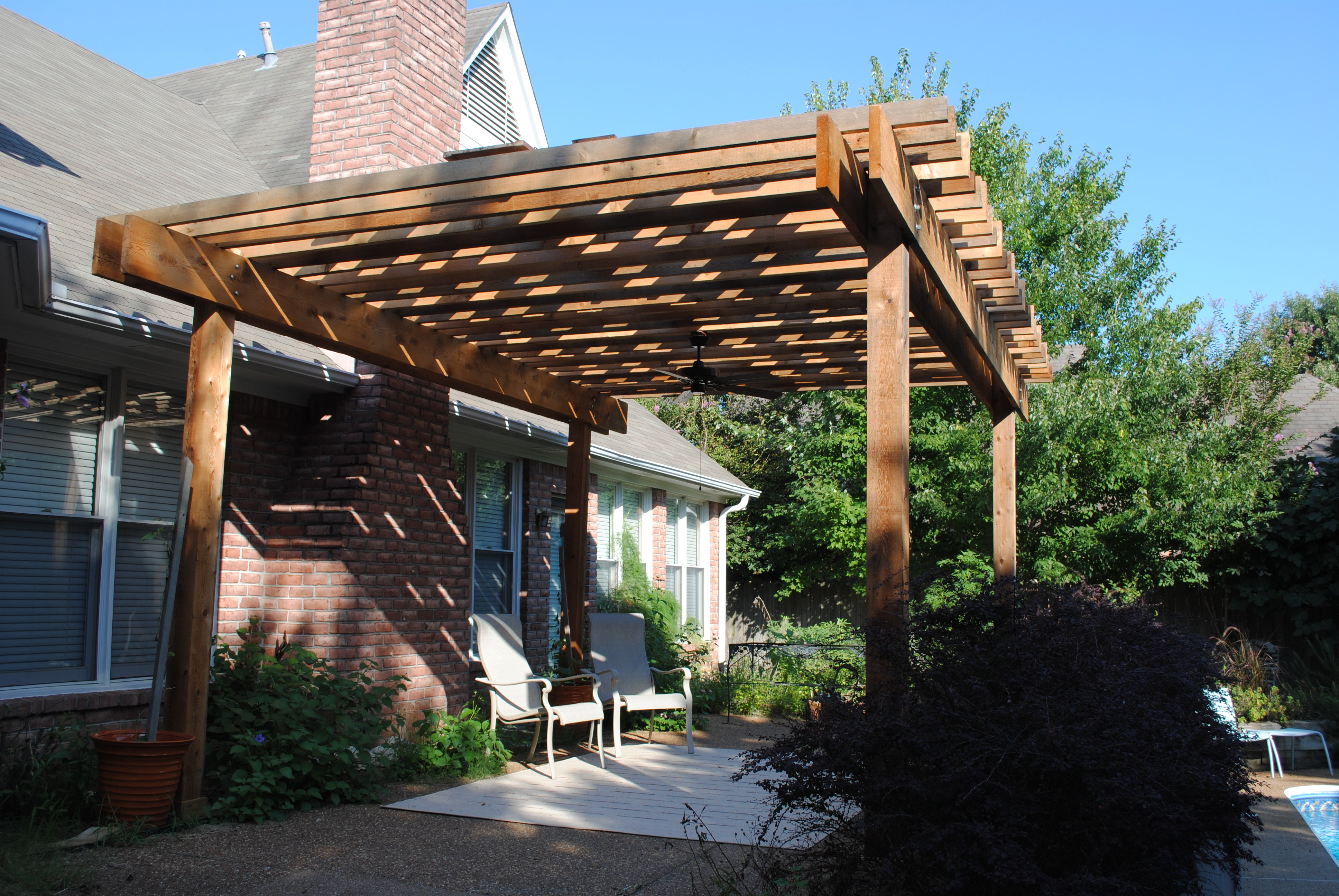 …my wife’s patio was now shaded with a pergola that included a ceiling fan for hot days.