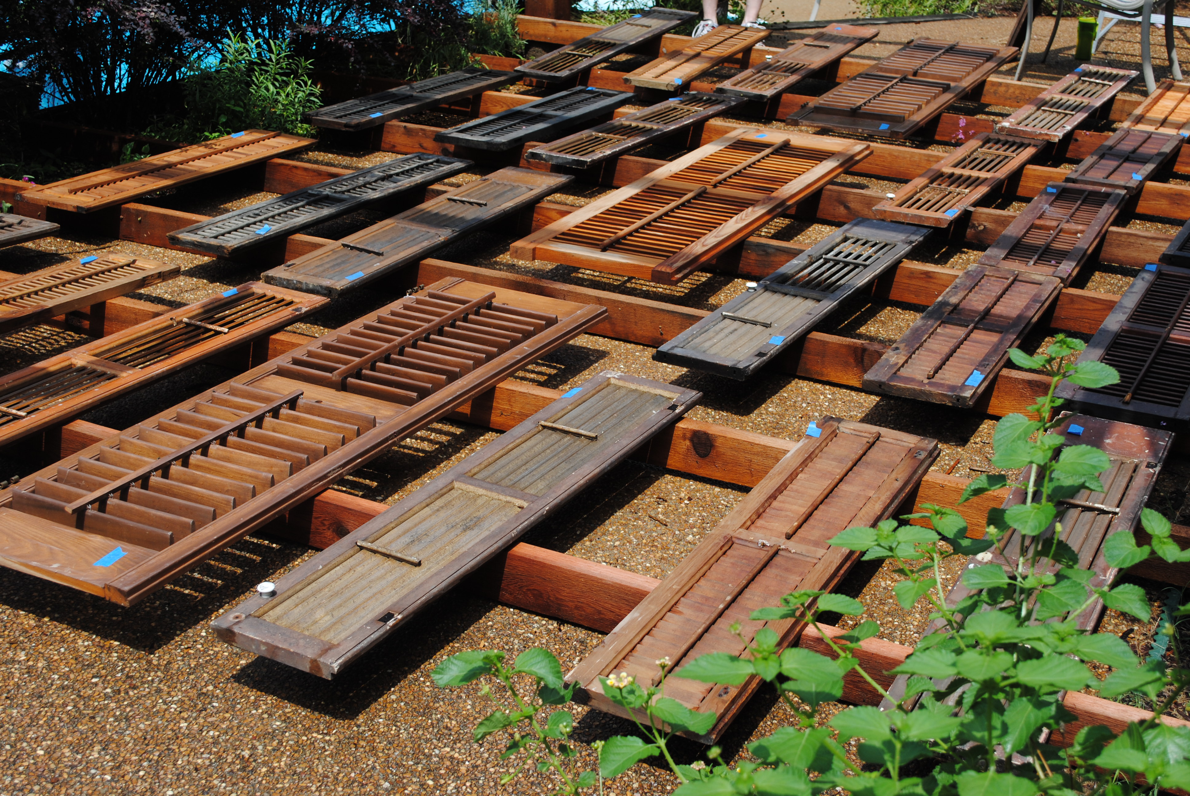 In 2012, we finally remedied the patio that had languished all these years thanks again to our landscape architect son who designed and helped build a pergola. Using a unique antique shutter roof…