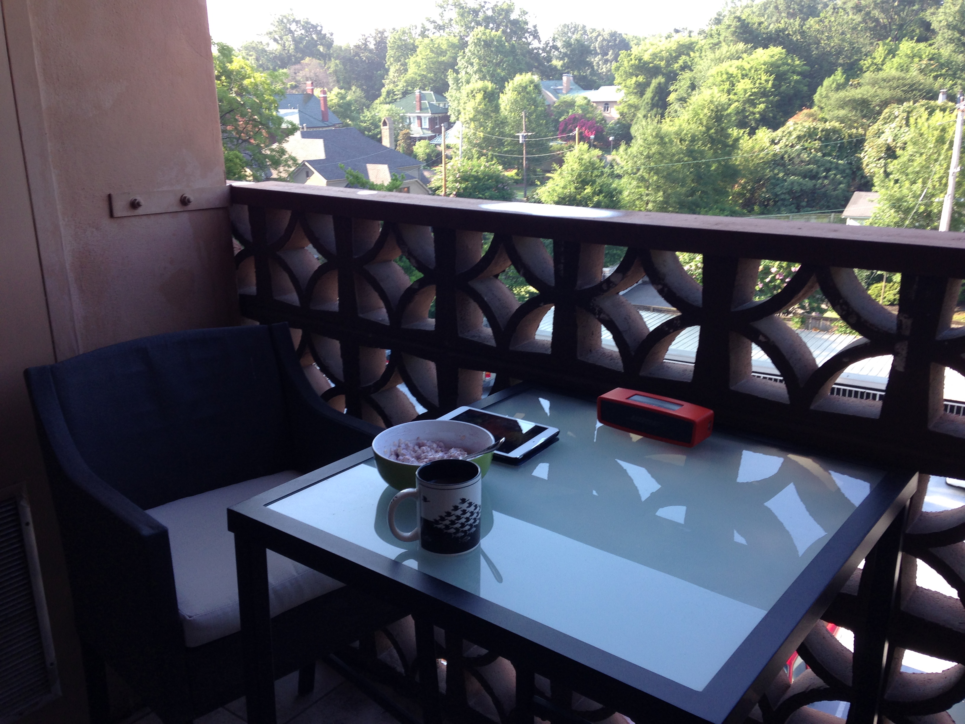 One of my favorite activities at the condo is sitting on the balcony in the morning, drinking coffee, eating breakfast, reading, and listening to soft jazz music. The cool of the morning is only enhanced by the chirps of birds in the park-like setting behind us and the sound of an occasional train whistle from the railroad tracks ½ mile south of our condo, one of my favorite sounds in the world.
