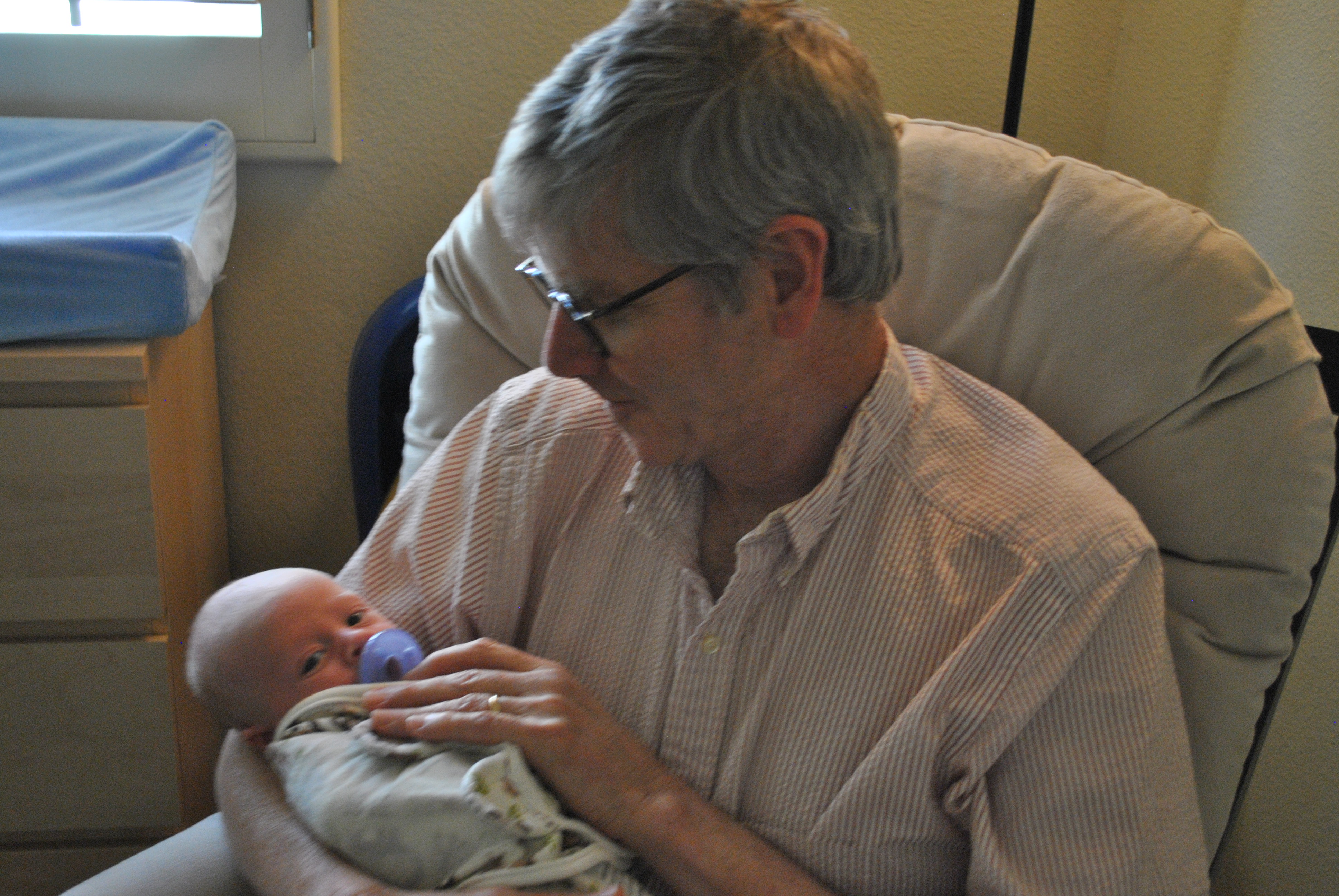 When he was sleeping in his basinet, I would pull up a chair next to him to read so I could pat him if he fussed. If he were extra fussy before falling asleep, I would bounce with him on an exercise ball to calm him and sing the same little sweet song my wife used to sing to our kids to calm them. Whenever I would rock him until he fell asleep, I was hesitant to put him down in his bed since it felt so good to just hold him, the touch of his head so soft and his fine blond hair so delicate. After he was asleep, I would continue to watch him and would occasionally be rewarded with a precious smile or a laugh and grin in his sleep. And when I got to feed him, he would make the most wonderful sounds while he was sucking down his milk—sounds I can’t even describe in words but a sound that expressed sheer love and happiness.