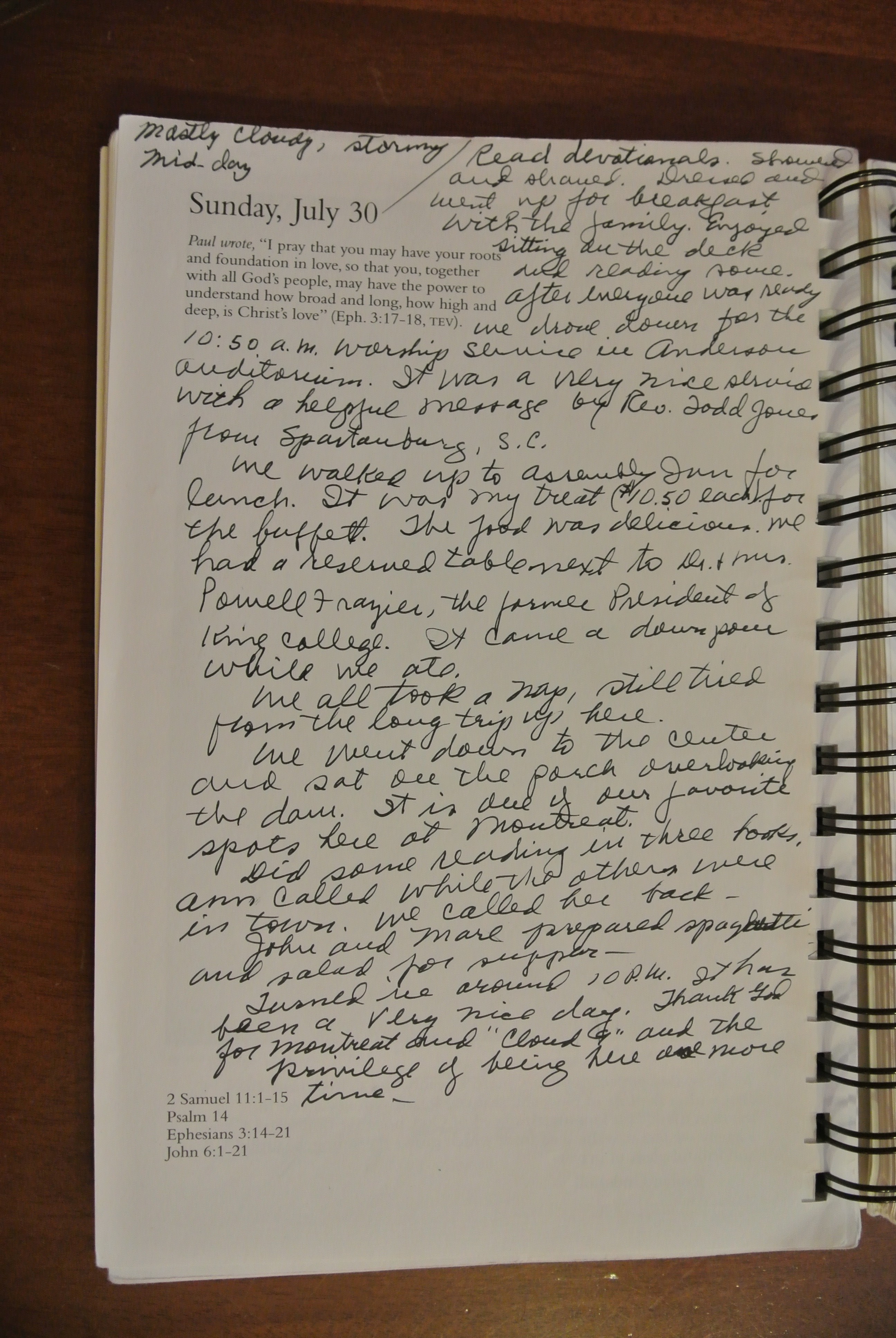 With 365 day’s worth of writings, it was hard to know which dates to focus on first. I started by flipping through the pages to my sibling’s and my birthdays and noted Dad had duly documented each one even including our age on that date. For my sister’s birthday in August, he was in Montreat with her and documented not only driving to Black Mountain to get her a birthday cake, but also walking to the Montreat general store and purchasing the Smoky Mountains calendars he and Mom always gave all four of us for Christmas each year.