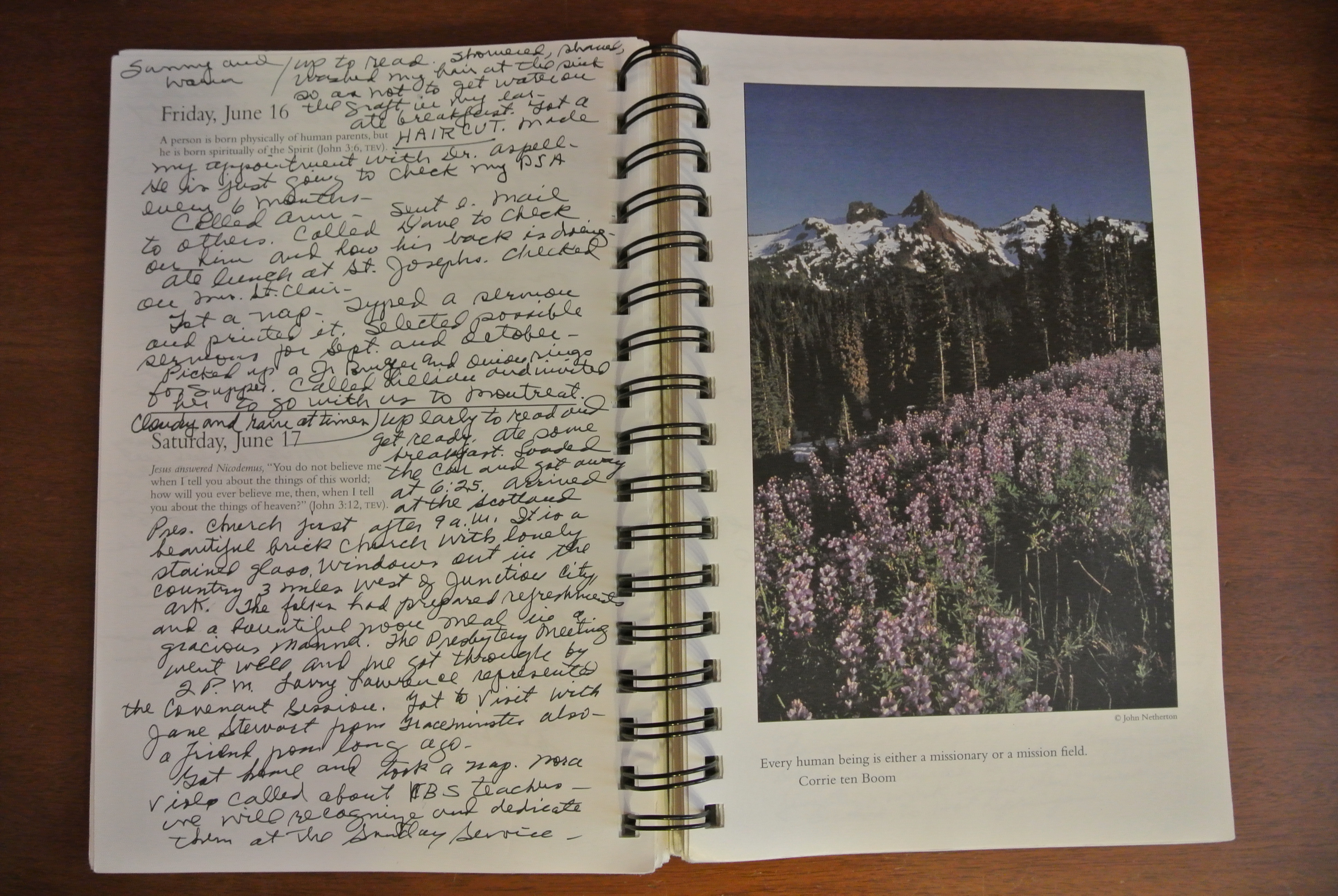 This is one of the birthday gifts that I gave my dad every year for his birthday, a daily journal with spiritual devotions and inspirational photos. In fact this is one of the journals I wrote about on my dad’s birthday last year. While I gave these to him each year for a number of years and I knew he wrote in them each day, I had never before read one until now.