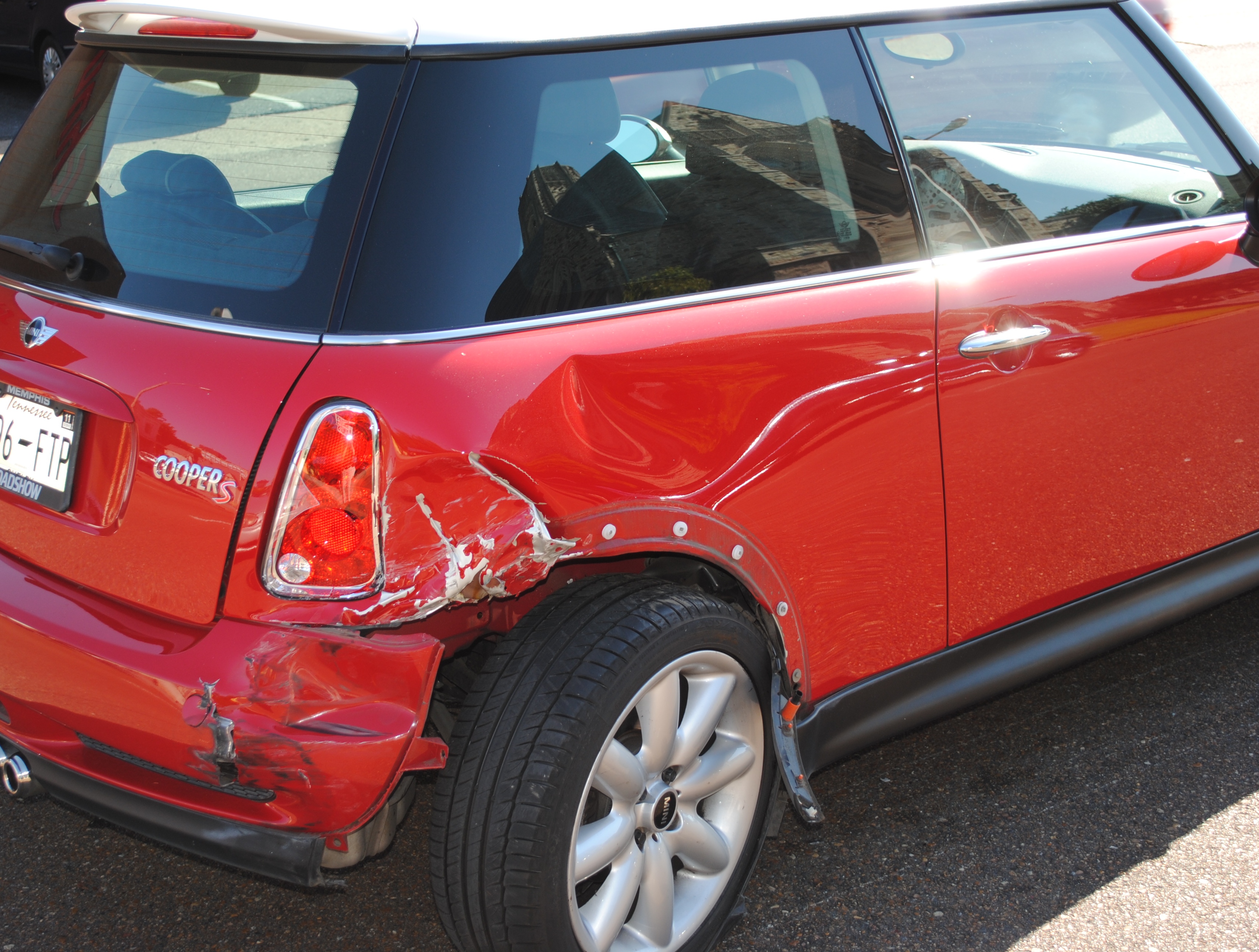 In 2010, my wife’s 2002 Jeep died and since our oldest son and daughter were both getting married the following year, my wife began to drive the Mini rather than us using the wedding money to replace her Jeep. It was sad not to get to choose which car to drive each morning but since it was the summer time, I’d usually have picked the ’02 Miata I was driving anyway. Then one day when my wife picked me up from work for a surprise weekend getaway, disaster struck—we got reared ended on our way downtown.