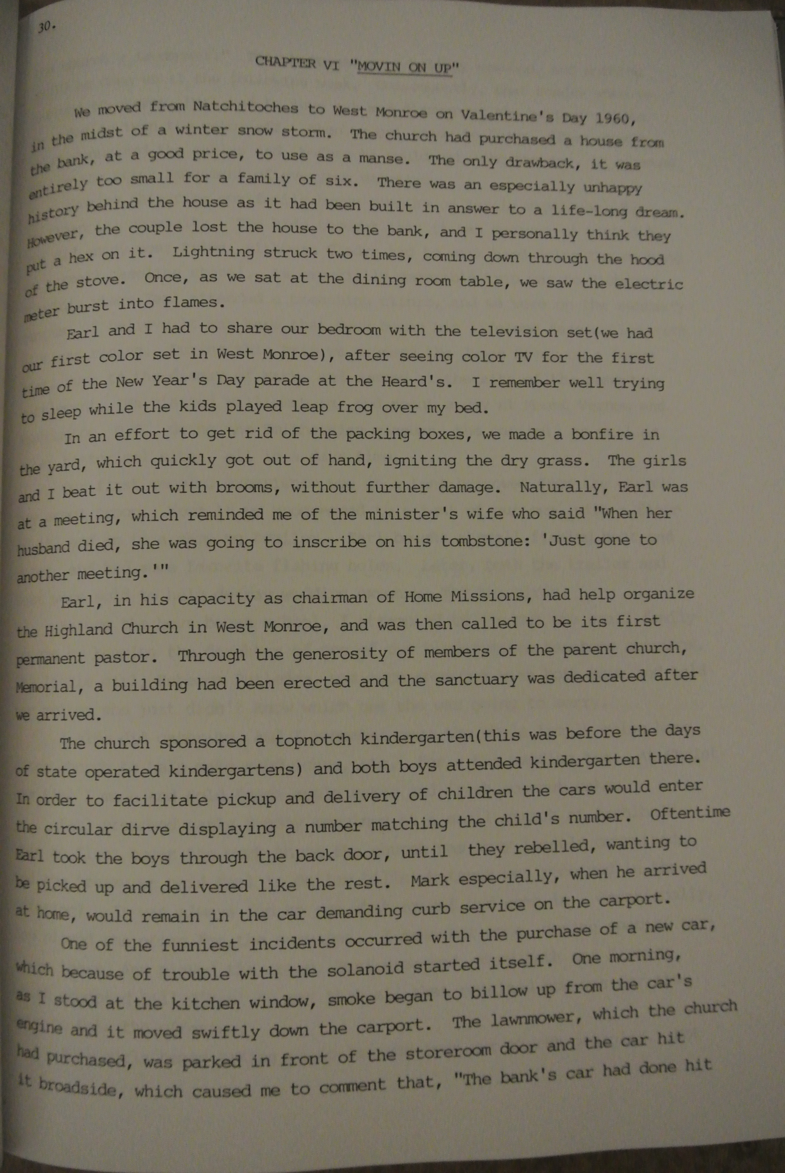 Following these two chapters, the narrative turns over to my mom’s voice as she tells of the first churches for which my dad was pastor. One funny story (although I’m sure it wasn’t funny at the time) was when prior to building a permanent church, my dad was preaching in an old dairy barn and a snake slithered through a hole in the wall. He couldn’t see why the congregation all of a sudden was very focused on him as they could see the snake but Dad could not.
