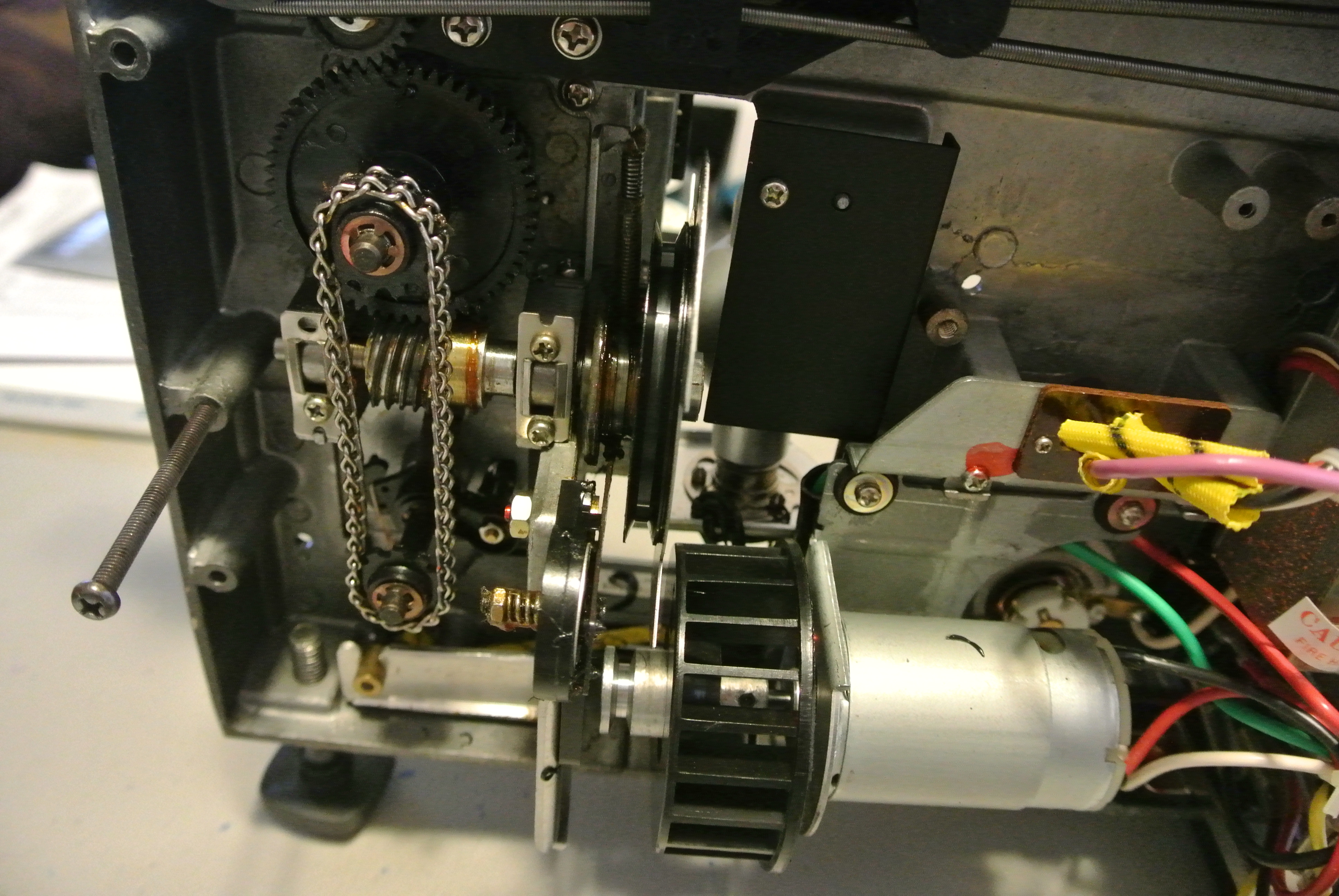 I braved to take off the back panel—the one normally labeled today “warning: no user serviceable parts inside” to discourage inquisitive minds—and could see that there was a chain drive still intact but the motor that drove the entire projector was where the mutilated belt had been stretched. I found more sticky bits of the belt that I had to try to clean out.