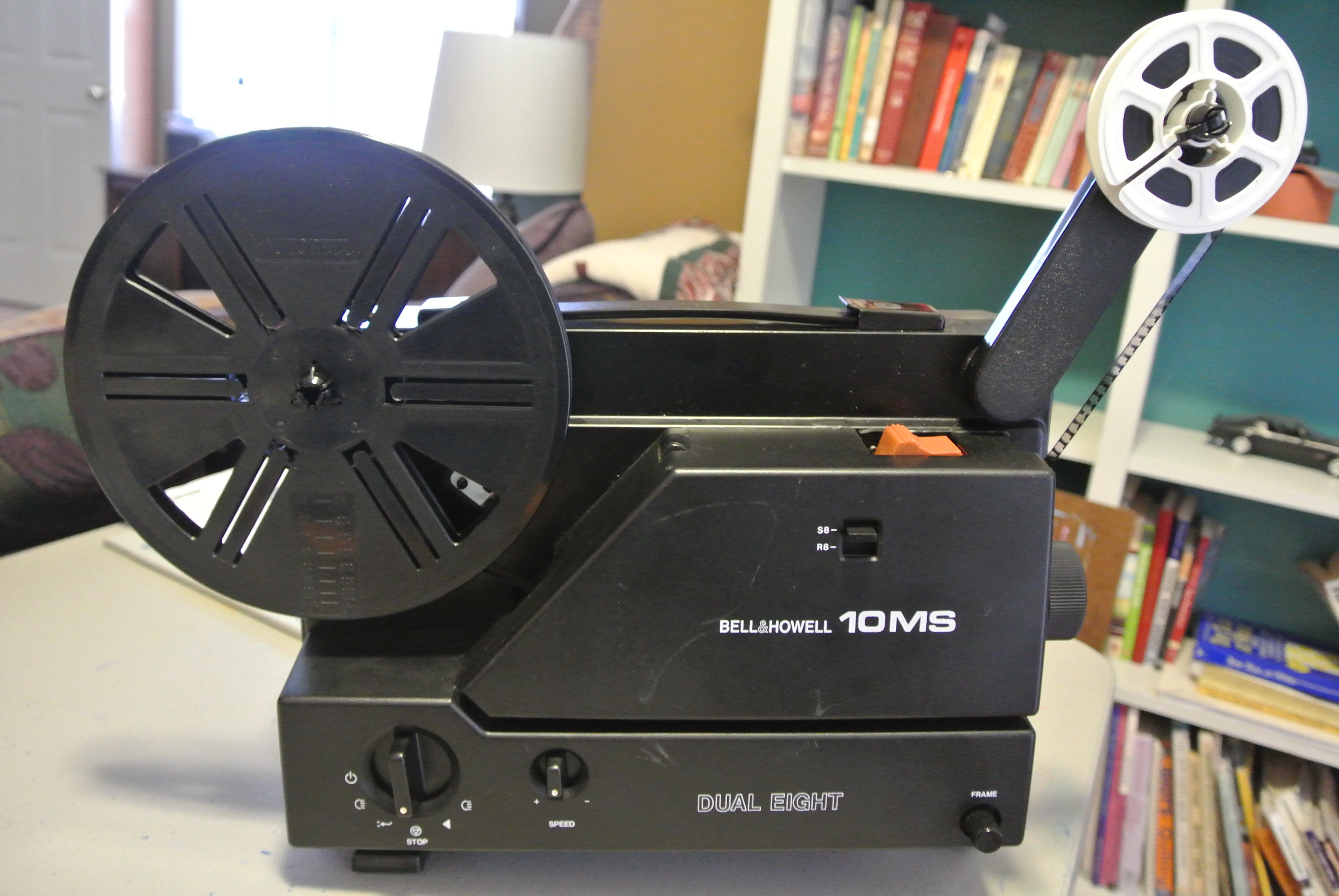 My wife joined me for the first viewing. As I fed the first film into the projector, it began to make a groaning noise and soon after gave off a burning smell—like the smell you get when a vacuum beater bar sucks up a spool of yarn—as if the O-ring was binding up on the pulleys, no doubt due to the O-ring’s wider girth in comparison to the slim, original belt. But it didn’t break and even though sounding labored, the projector continued to run.