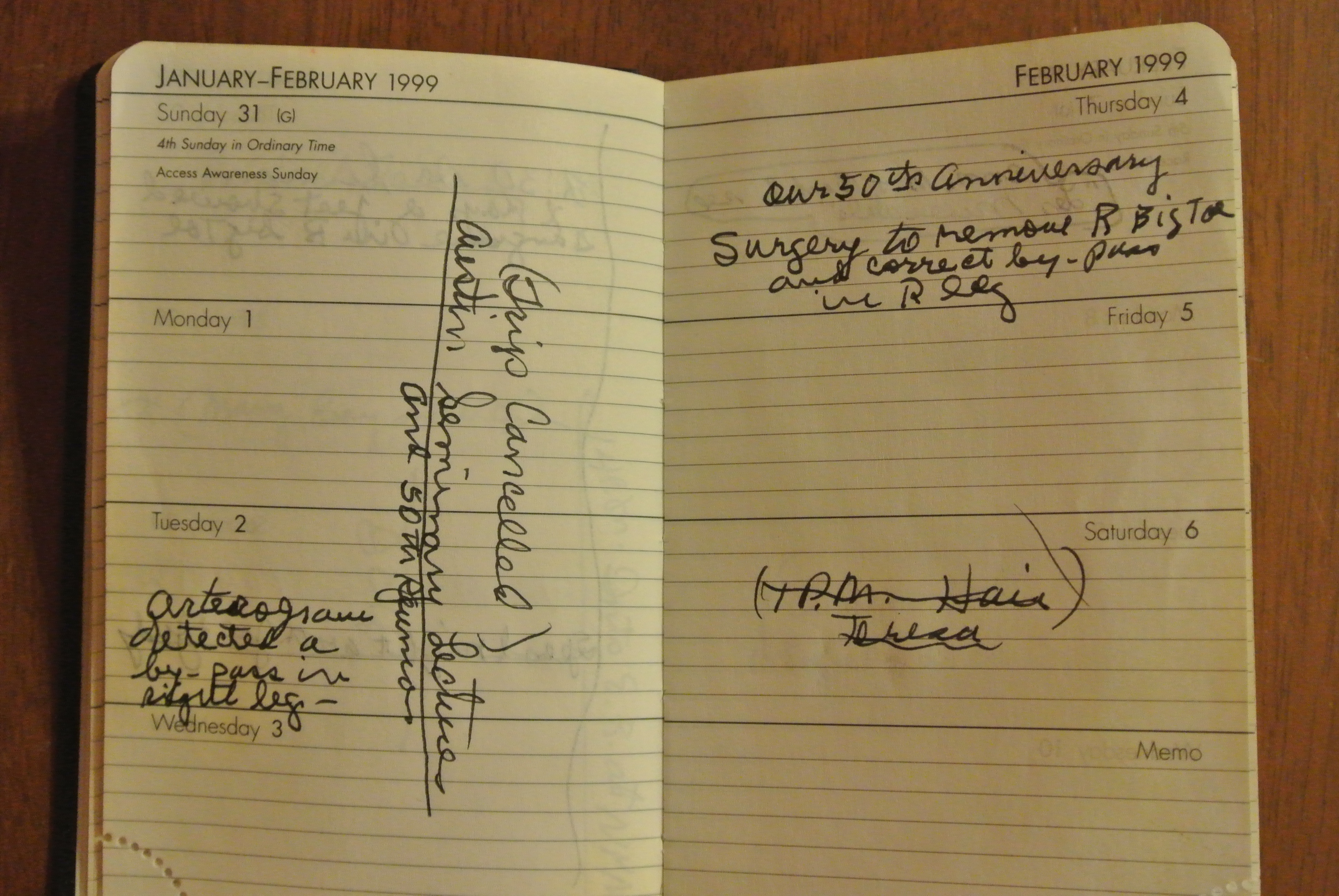 Sadly, this particular calendar book also chronicled the cancellation of my parent’s annual trip to the Austin Seminary Lecture series where they were to celebrate their 50th wedding anniversary (The family anniversary celebration had occurred the previous August in Montreat, NC). The reason for the cancellation of this trip was my mom’s hospitalization and surgery; a malady that ultimately led to her death also documented a few pages over in the calendar book.