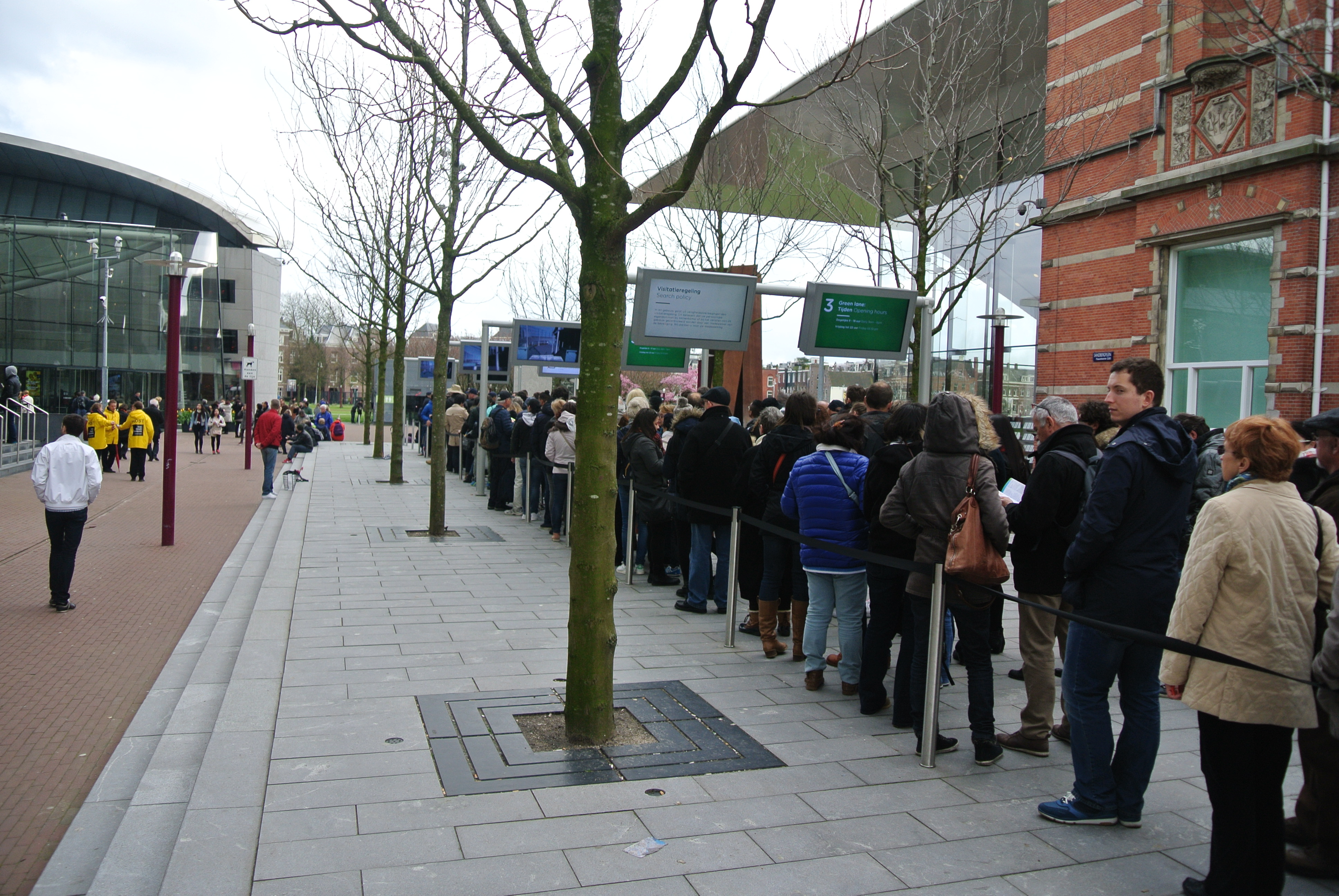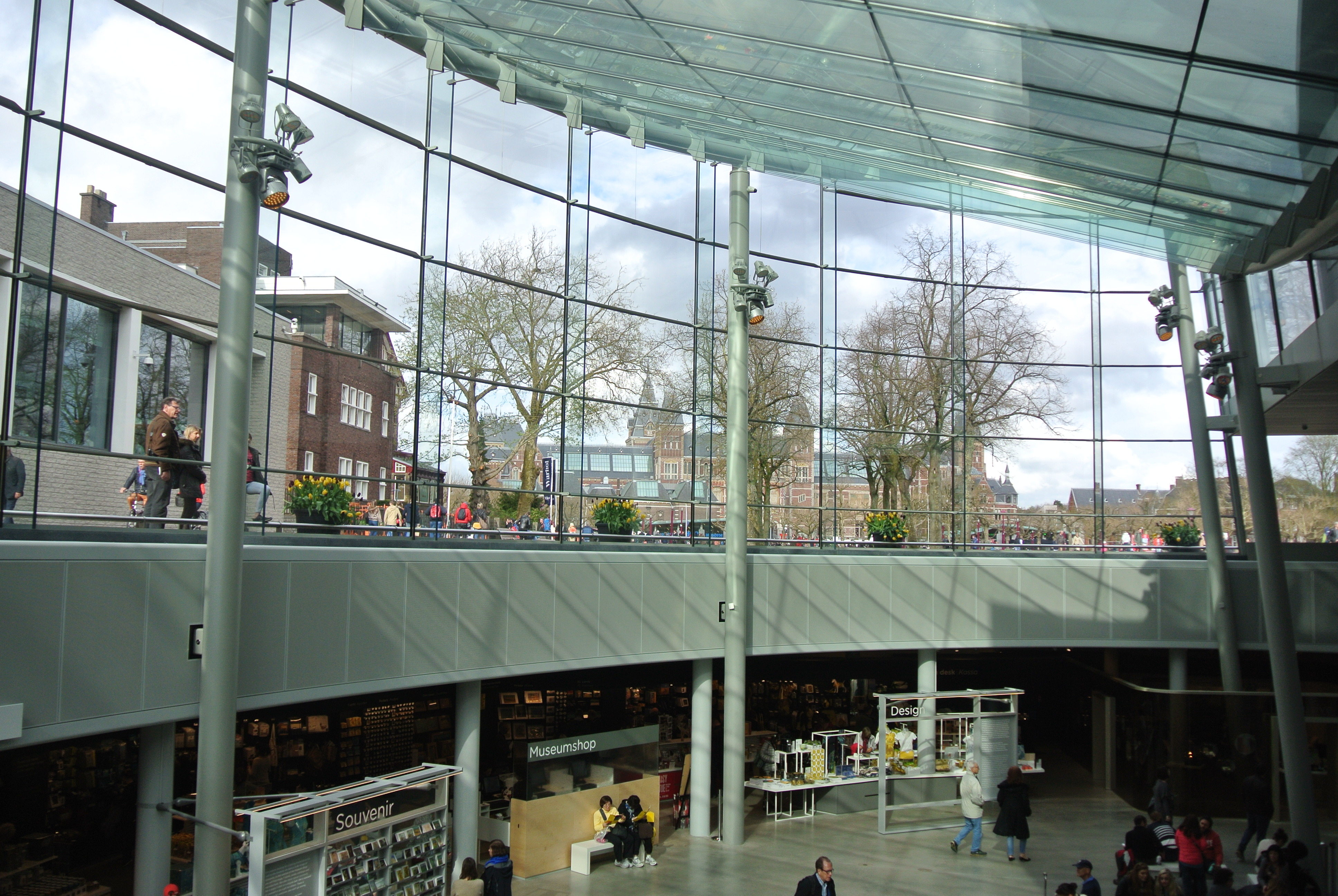 After about 20 minutes, I had my admission ticket (again free) but rather than entering through a side door, was directed to enter the separate addition to the building that was added almost 20 years ago. It felt like I was coming in the backdoor but as I descended the stairs to the cloakroom, I had a wonderful perspective view through the glass of the new Van Gogh building with the centuries old Rijksmuseum a short distance away.
