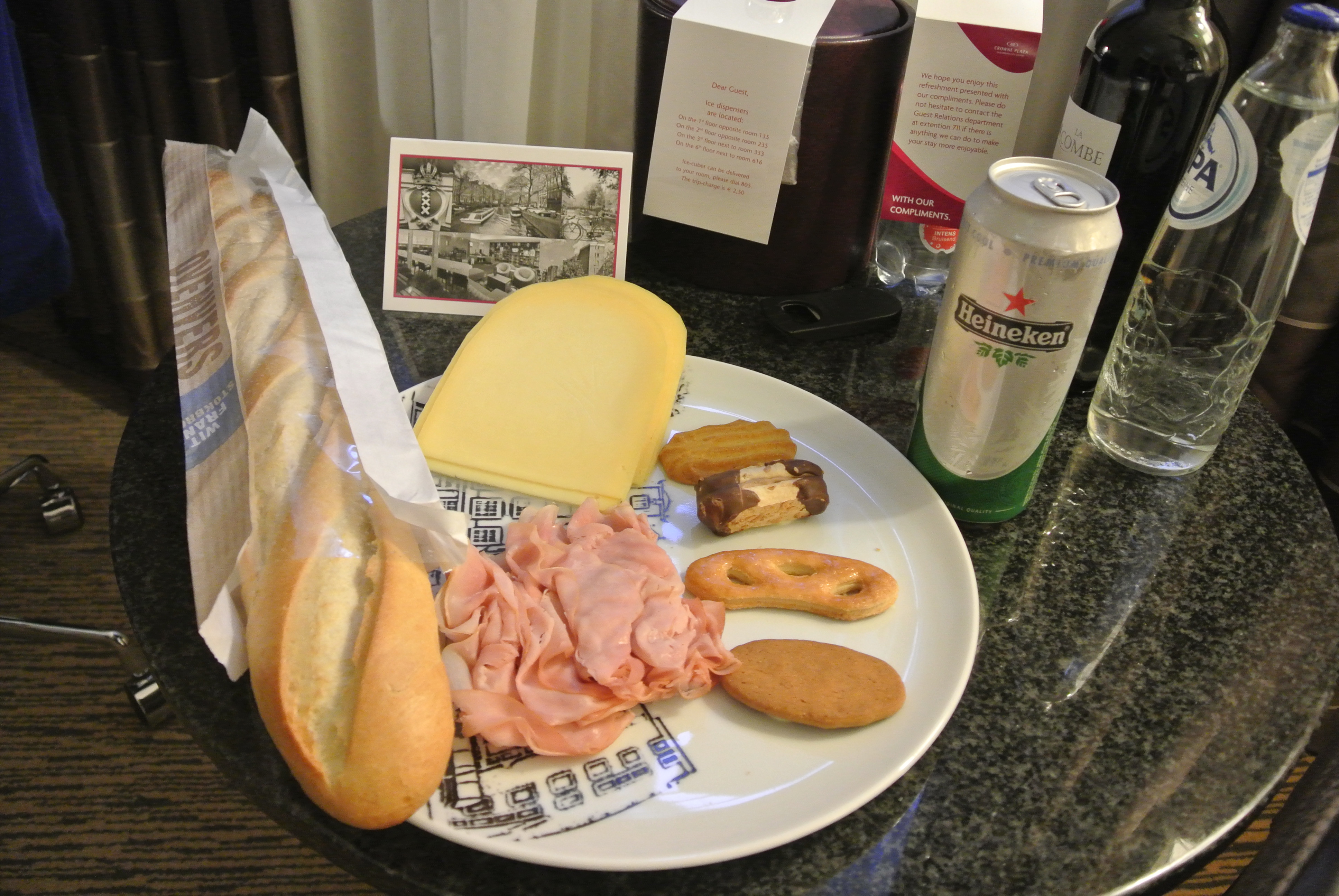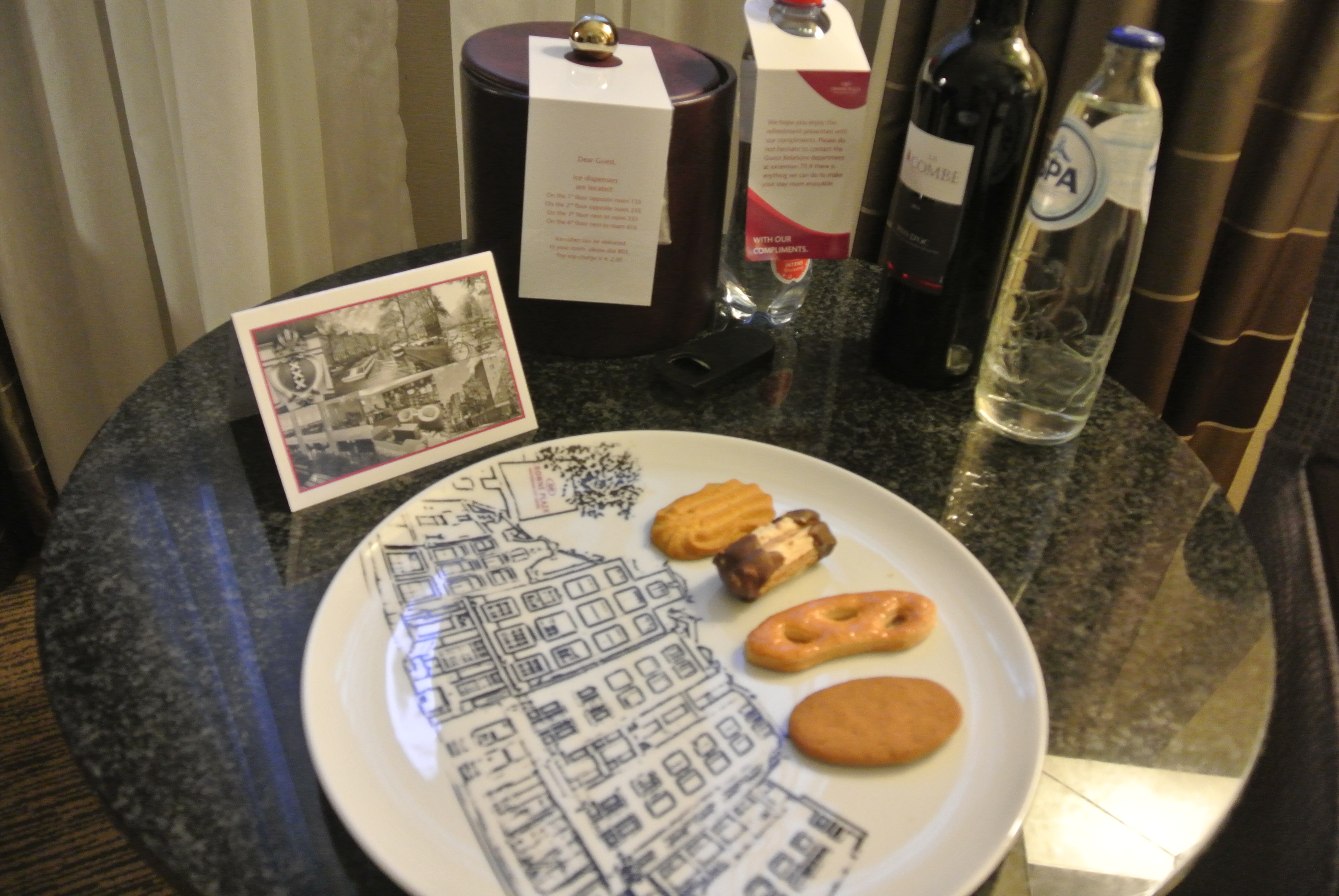 When I opened my door, I found that the hotel manager had left me a welcome package of wine, water, and desserts.