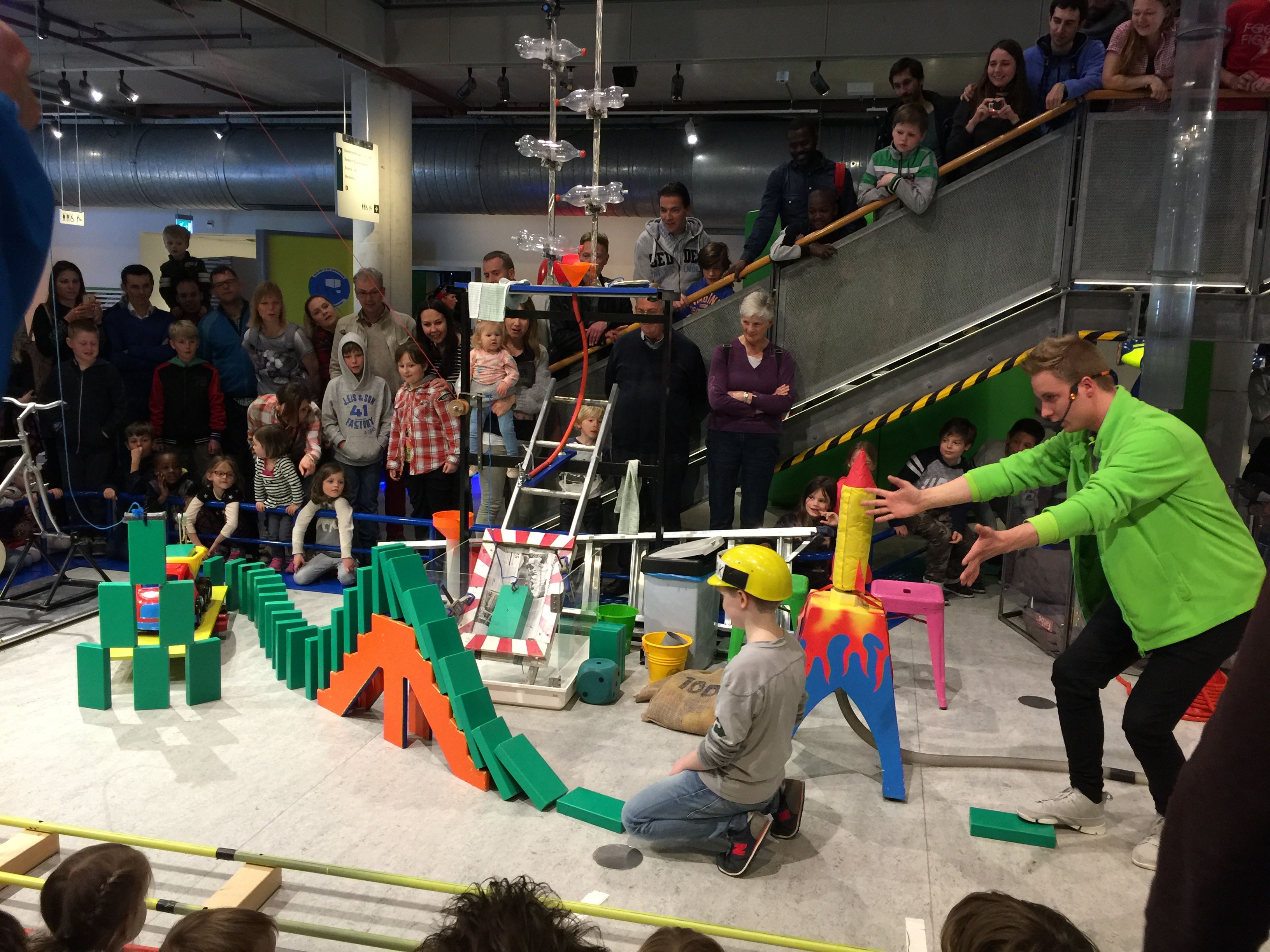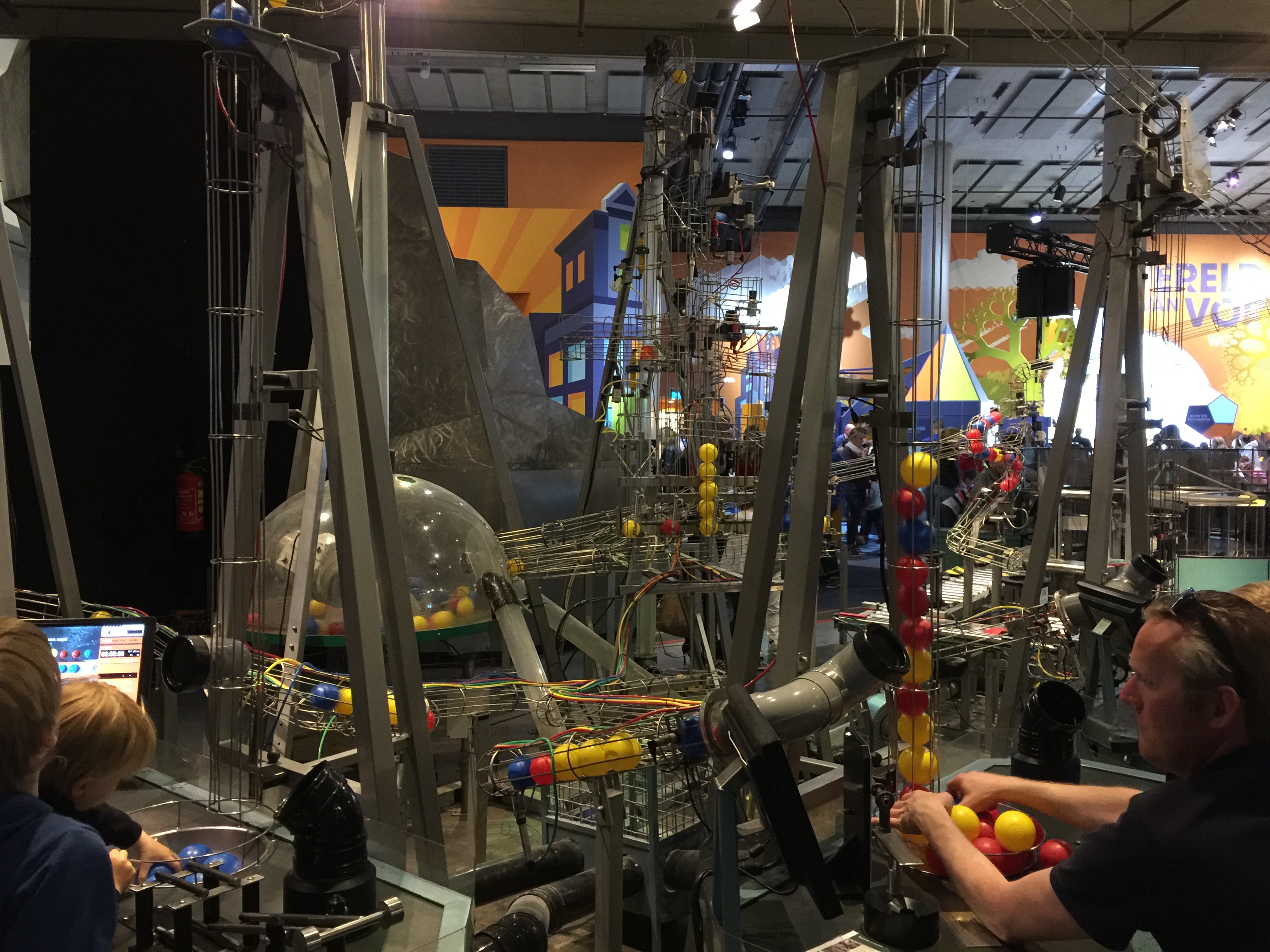To me though, the highlight was the chain reaction exhibit where the tumble of a single green domino, set into motion a chain of unrelated, but interconnected events that took a full 10 minutes to ultimately work its way back to almost the starting point and launch a rocket upward by compressed air power.