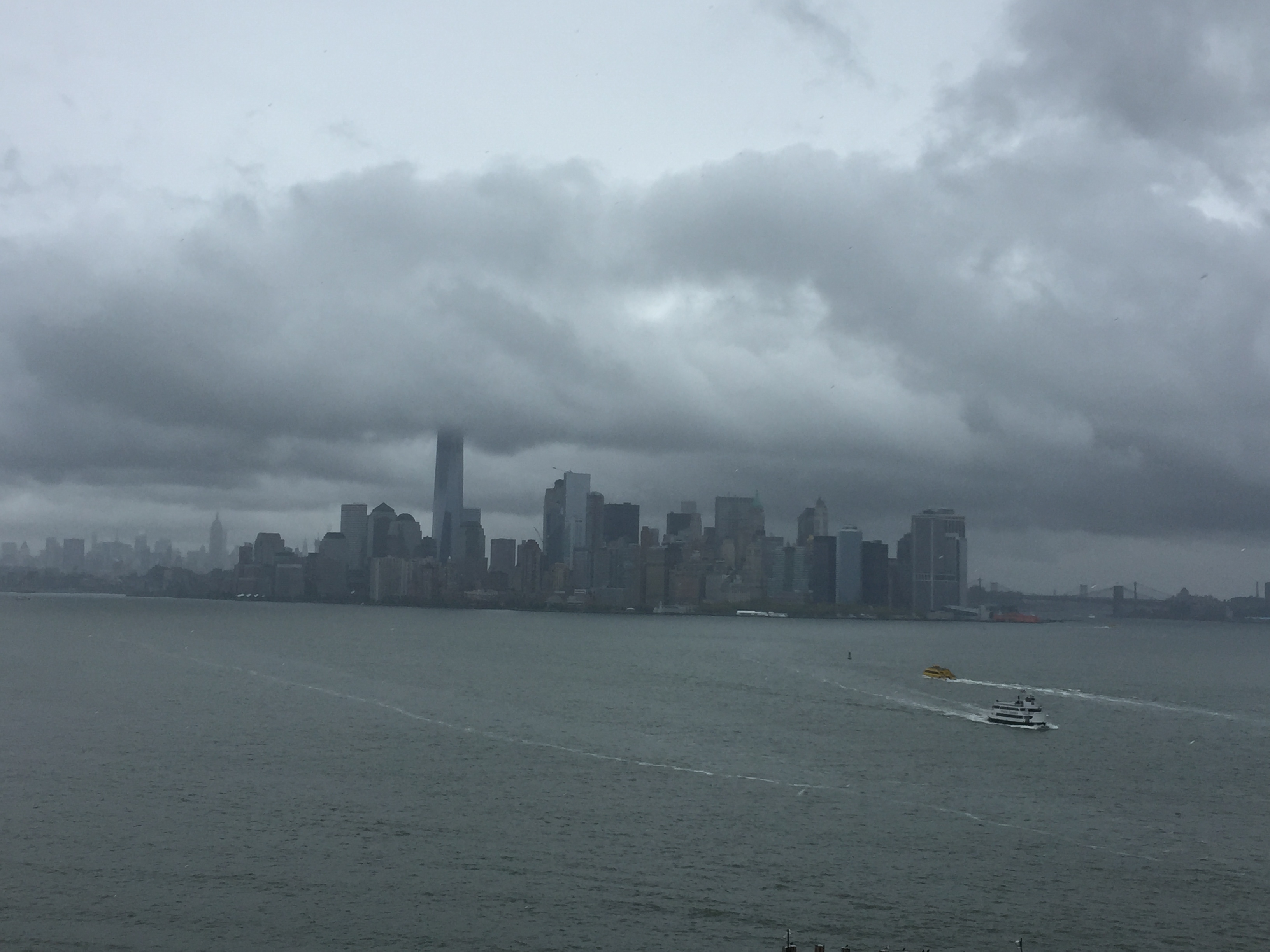 It was my Eiffel Tower experience all over again where it had been raining so hard, we couldn’t even leave the hot and humid interior of the structure for a photo without getting drenched (ironic connection to this rainy Liberty experience, the interior support structure for the Lady was also built by Gustave Eiffel). I did manage to brave the rain long enough to get a photo of lower Manhattan with the Freedom Tower shrouded in clouds.
