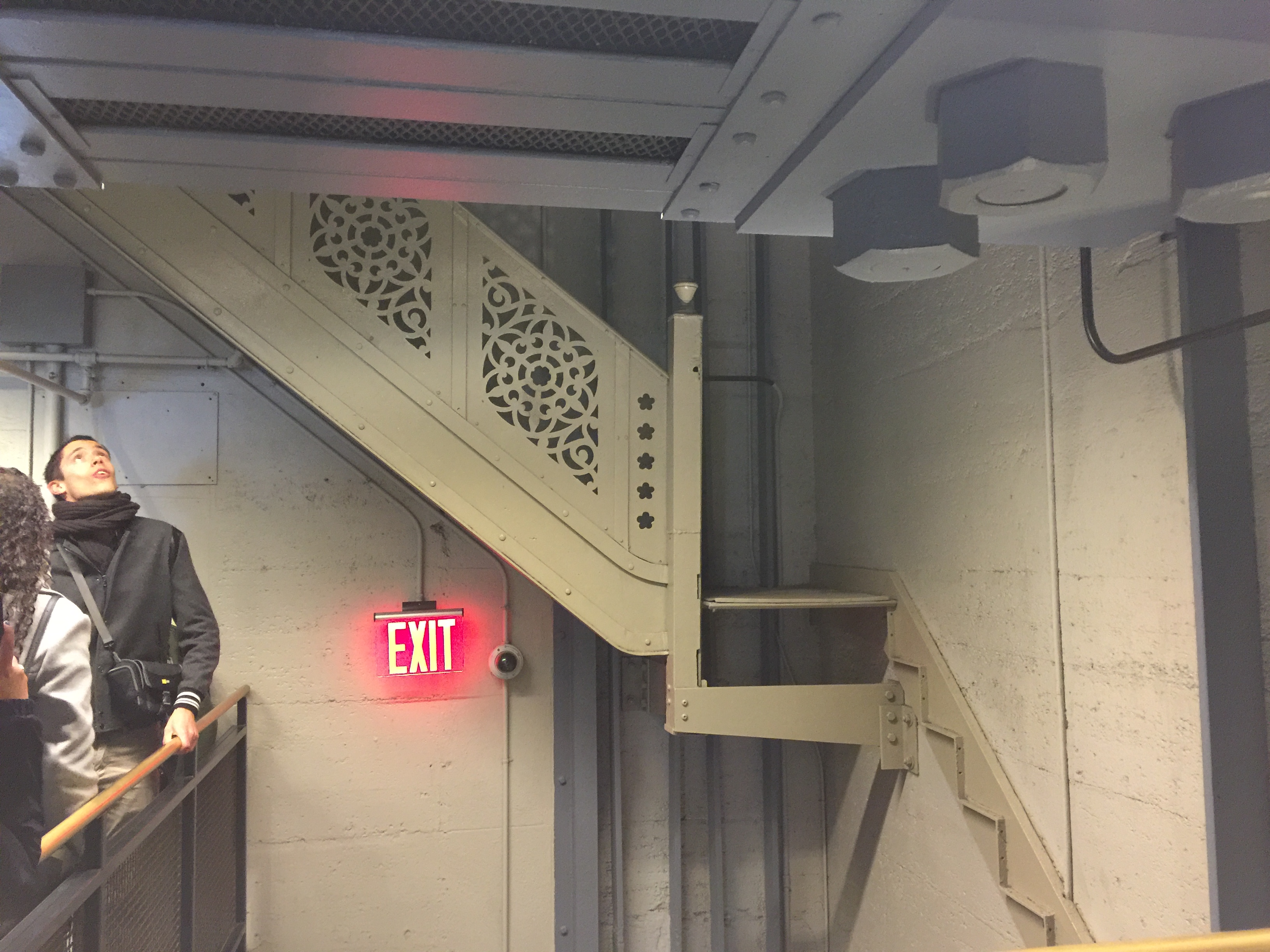 Following the line through for pedestal and crown ticket holders, I then came to a long line awaiting the elevator but a short line to the stairs. Being an avid Fitbitter, I took the shorter line for the stairs. I don’t know how many steps I ascended (it was estimated to be a 5 minute climb) but at the top I was met with a small space and two doors to the outside balcony, through which I could see it was still raining.