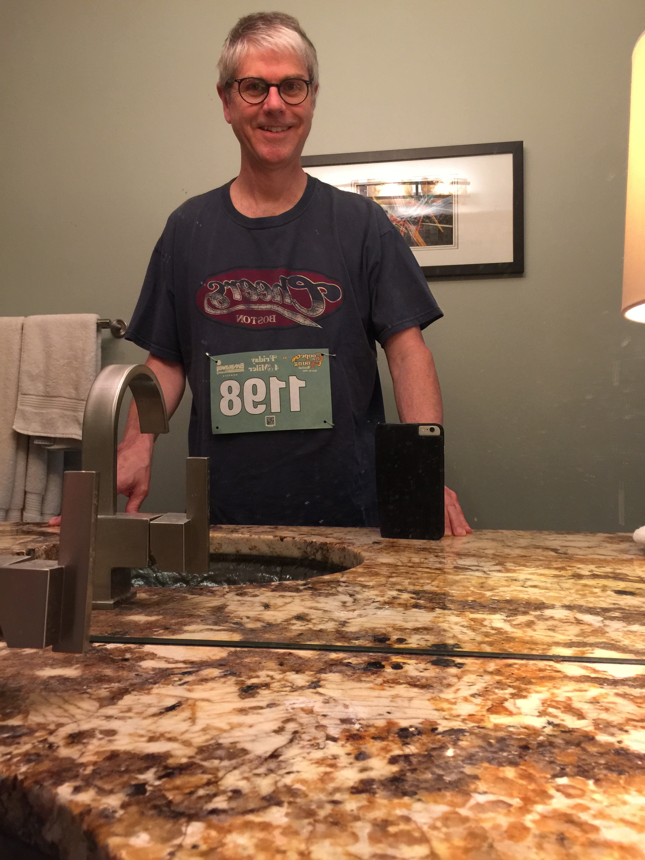 The next day, I checked the race results and found for my gender and age group that I had finished 20th out of 39 finishers—middle of the pack just like eight years ago. But what was even more amazing was that I had run the four miles in 41:44 for a pace of 10:26 per mile. The last time I was able to time myself was several years ago when I ran 2.5 miles on a treadmill at 6 miles per hour (a 10:00 pace in an air-conditioned gym). To mark this occasion, I took a celebratory photo of me in my well-earned t-shirt…