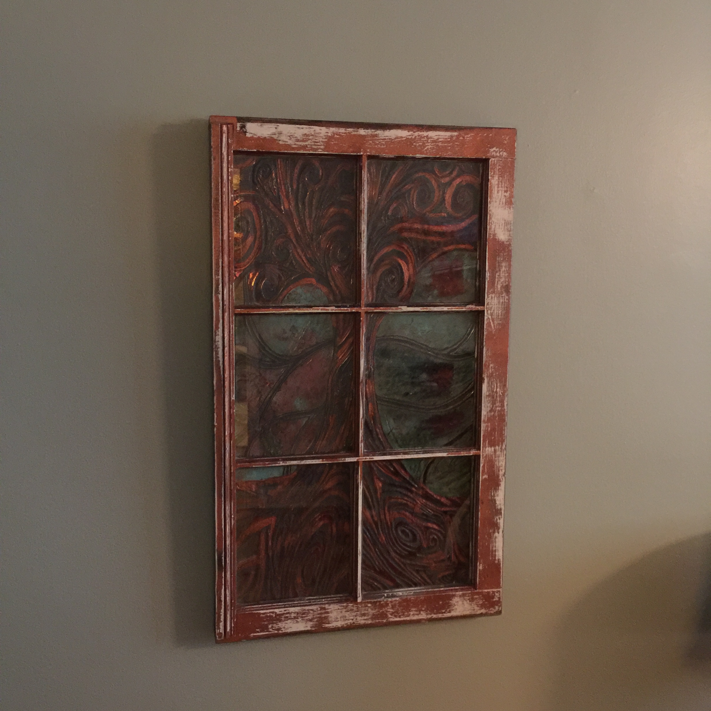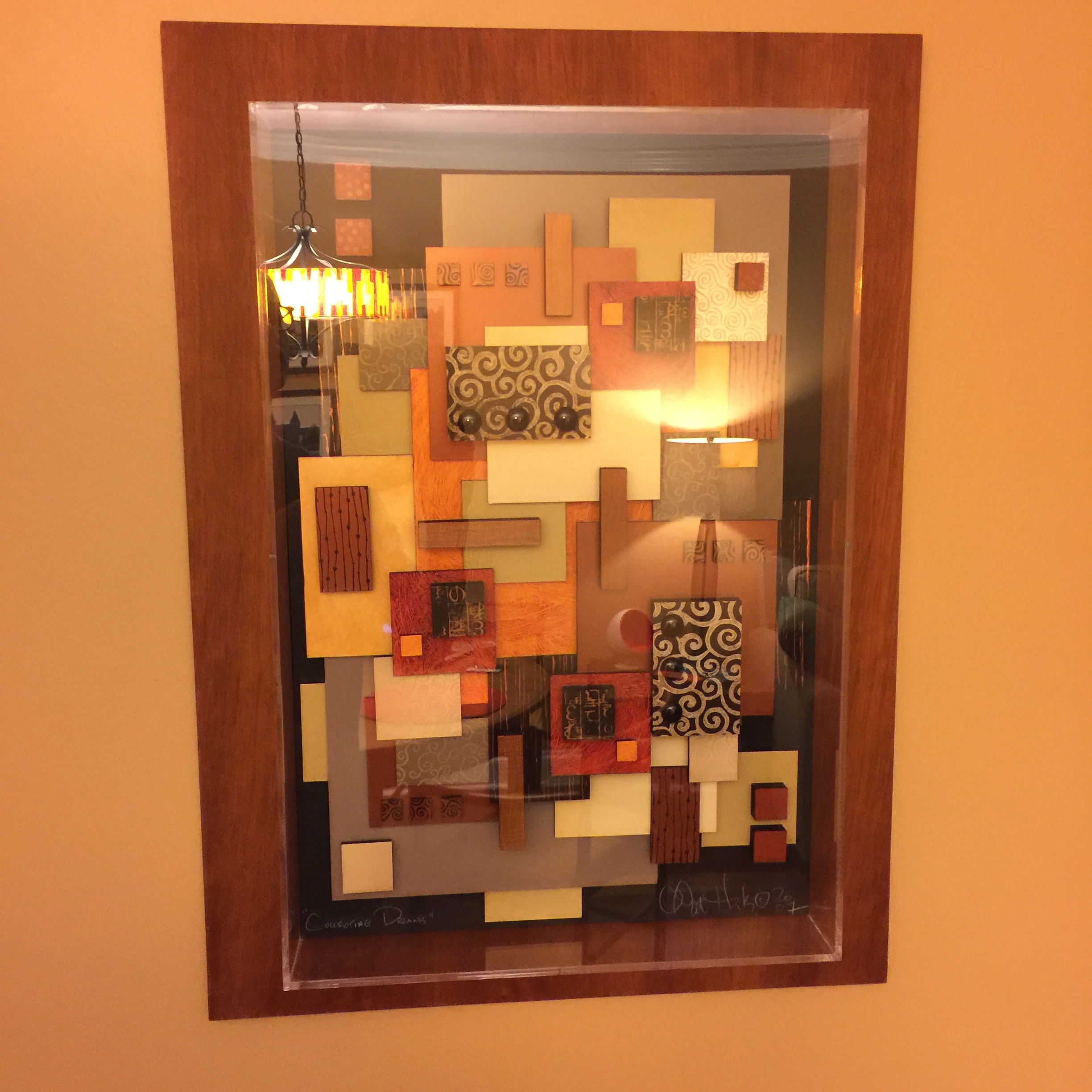 But we had trouble finding what would go on the cabinet as well as above it on this small wall. Then one time when my wife was out of town, I brought two of my favorite items from home just to try them out: one that I refer to as my “fake Chihuly” and the other a three dimensional piece entitled “Collecting Dreams” that we had gotten one year at the River Arts fest.