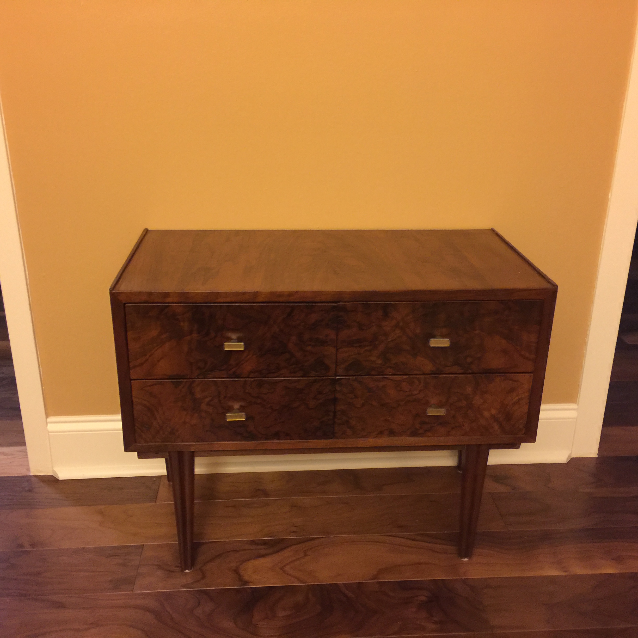 For a while, all that was there was a 1950s set of nesting tables my wife had shipped from Denmark. A small cabinet eventually replaced this; another Internet find.