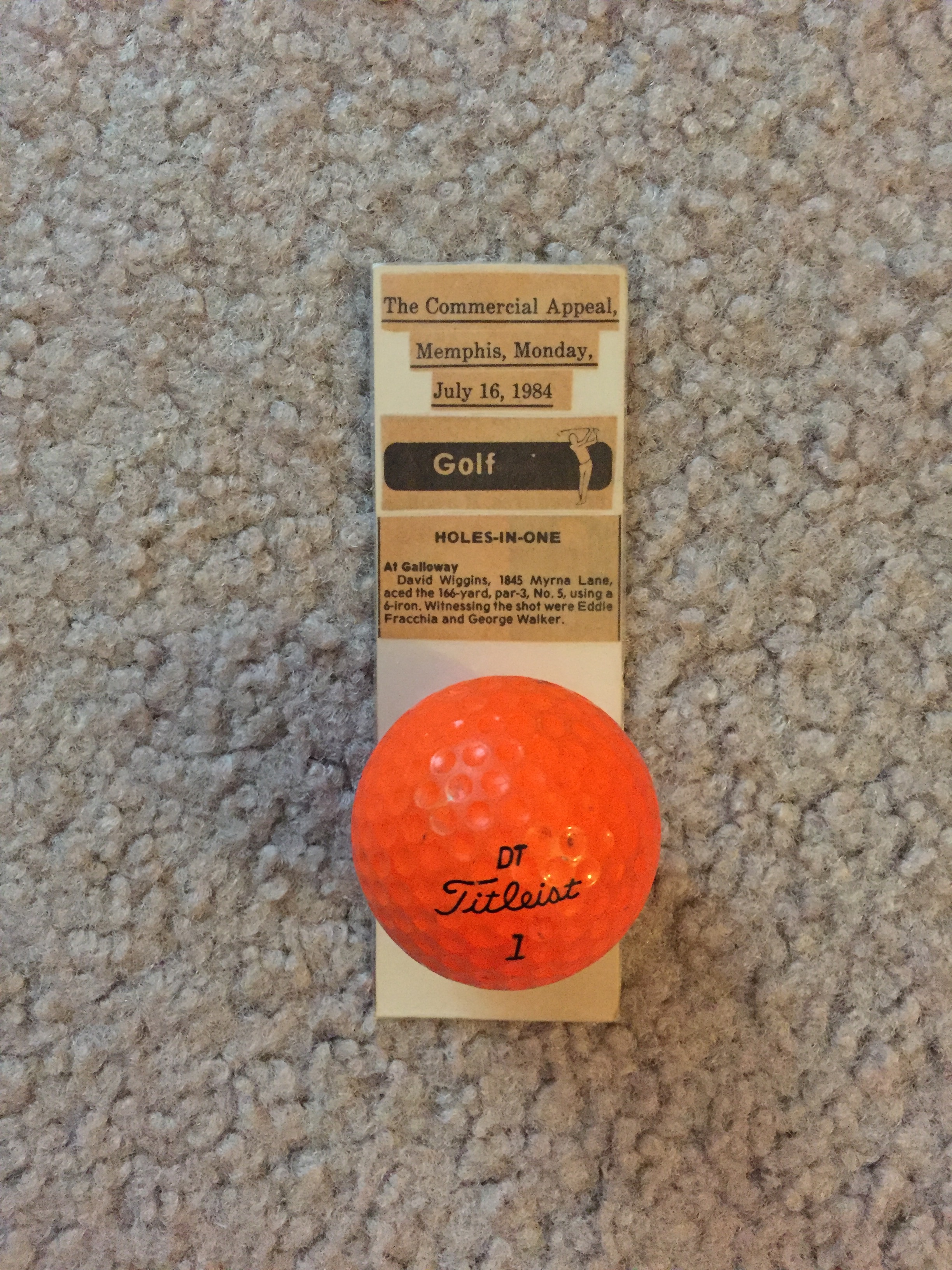 For my ace, I got my name in the newspaper and I still have the ball. Around that time, my father-in-law also made a hole-in-one and he got his ball nicely mounted on a wooden plaque along with his scorecard. I didn’t feel right doing that as the “1” on my scorecard was sandwiched between a triple bogey “7” and a double bogey “6”.