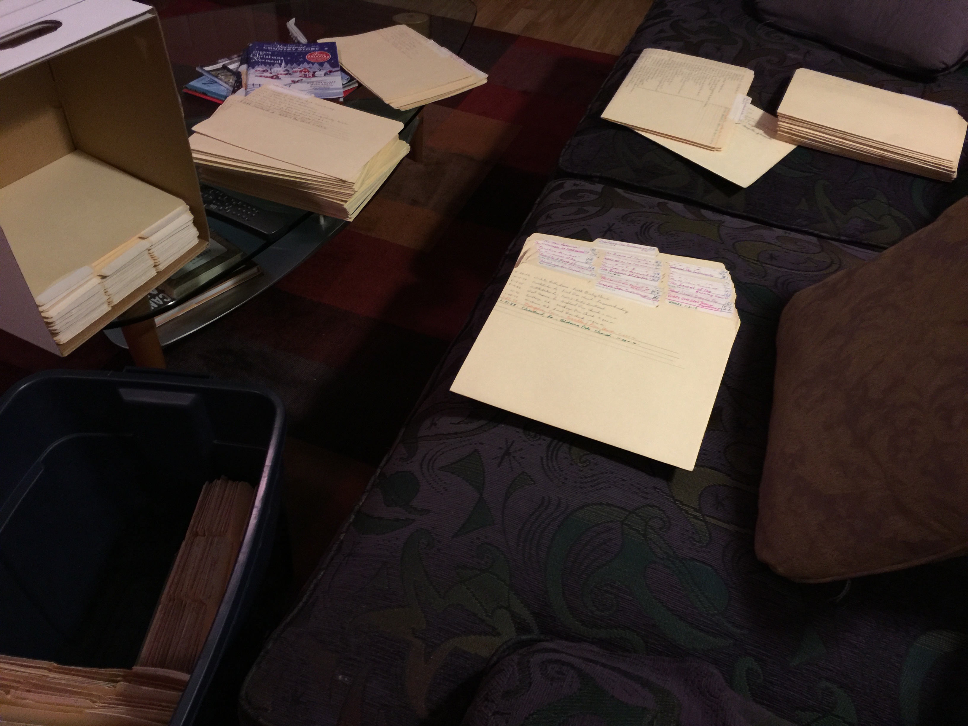 As I pulled handfuls of folders from the first bin, they were in somewhat numerical order. But then I would run across a number series well before or after the stack I had just pulled. Soon I had several stacks of sequences and I began to put them in the box in order, starting with number 1. It was a little like assembling a puzzle.