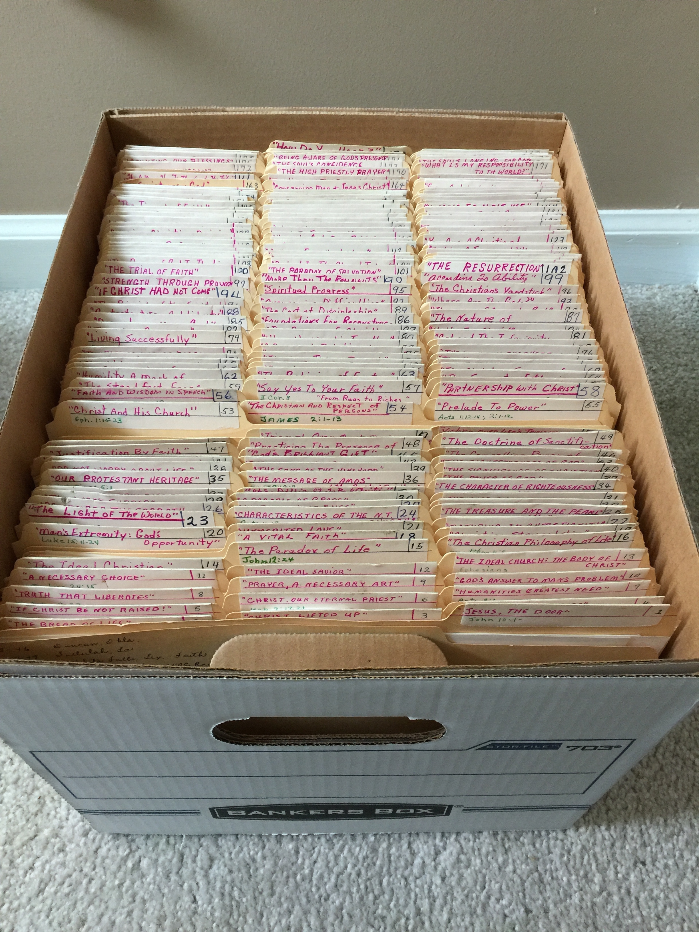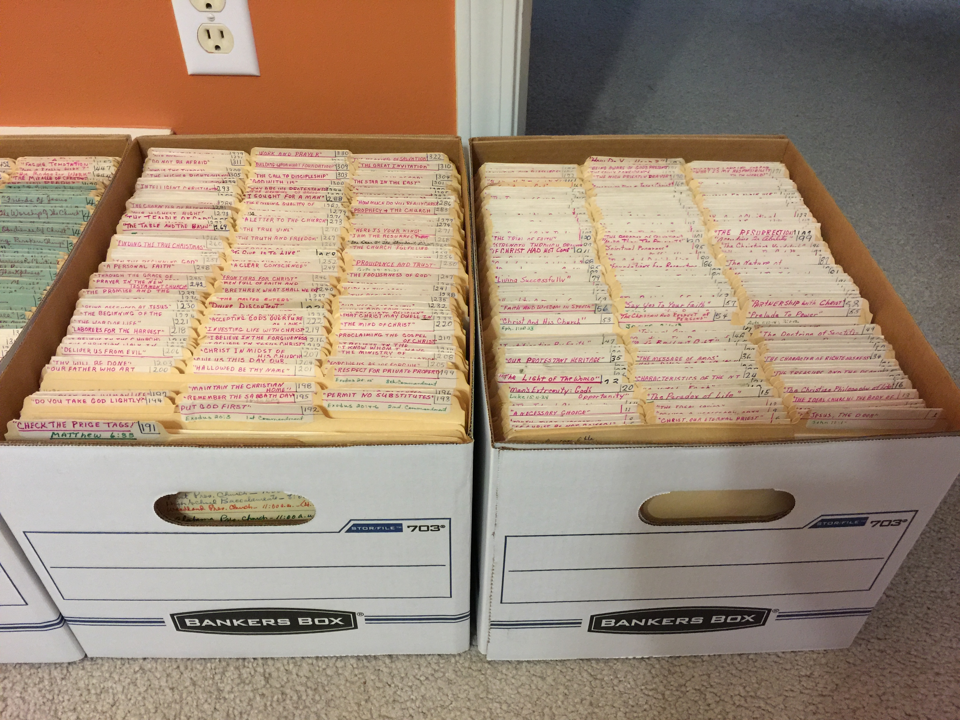 I had come to the realization over the past month that each time I thought about these sermons, the next step of my discovery process was really going to be predicated on my getting them more organized. While each bin represented one drawer from my dad’s file cabinet, the folders inside the bins were in random order as we had pulled them from the drawer. Since I didn’t have an empty file cabinet of my own to put them in, I raided my wife’s stash of Bankers Boxes.
