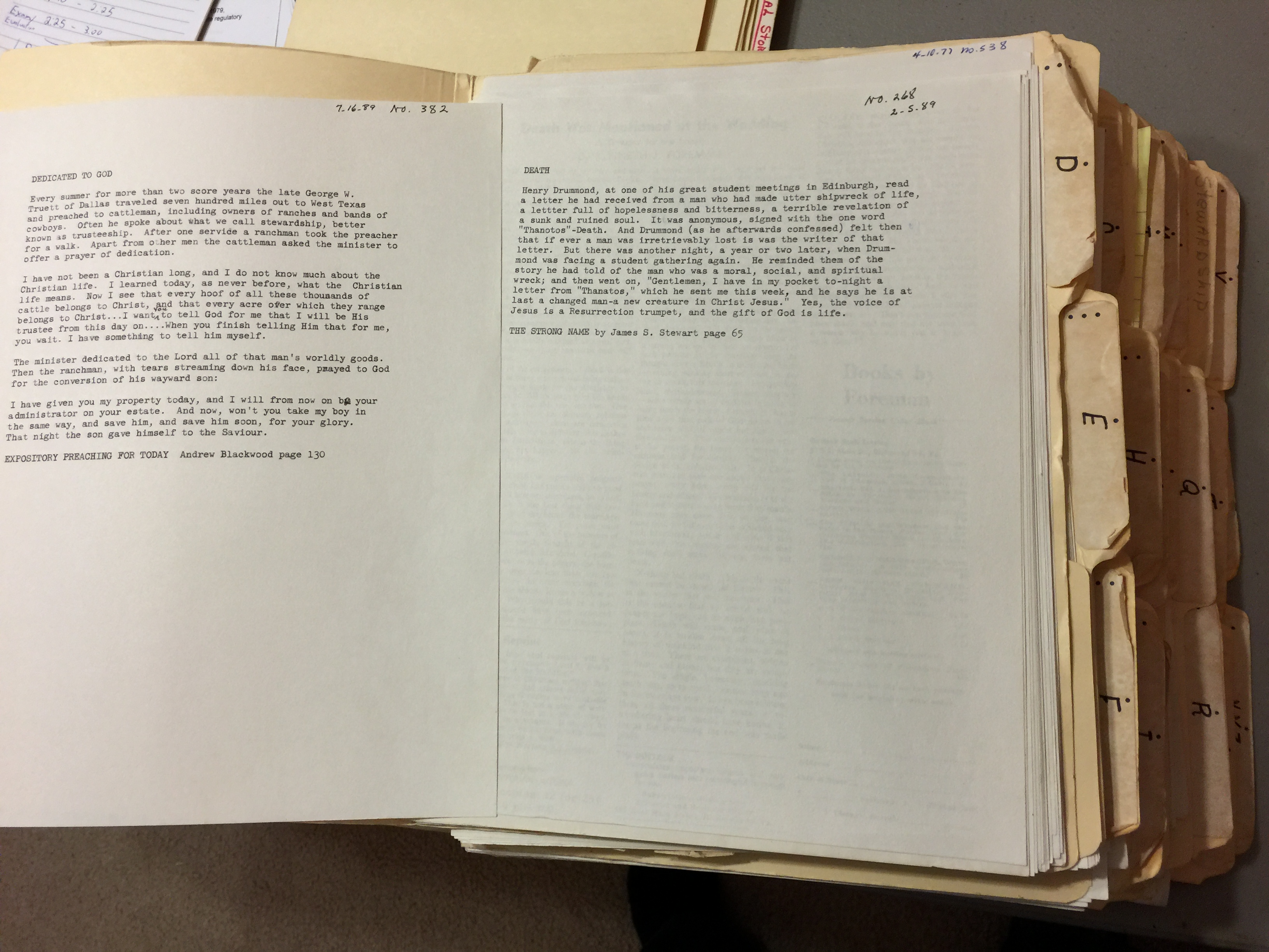 I opened a few of these and found that they were individual typed pages with quotes from books Dad had read that he thought could be included in future sermons. And in the top right corner in Dad’s organized fashion, there were hand notations as to when and which sermon he had incorporated the idea. I recalled from reading the 32 sermons last year that Dad would often quote verbatim a passage from some learned source in his sermons. Now I understood how he was able to easily access those.