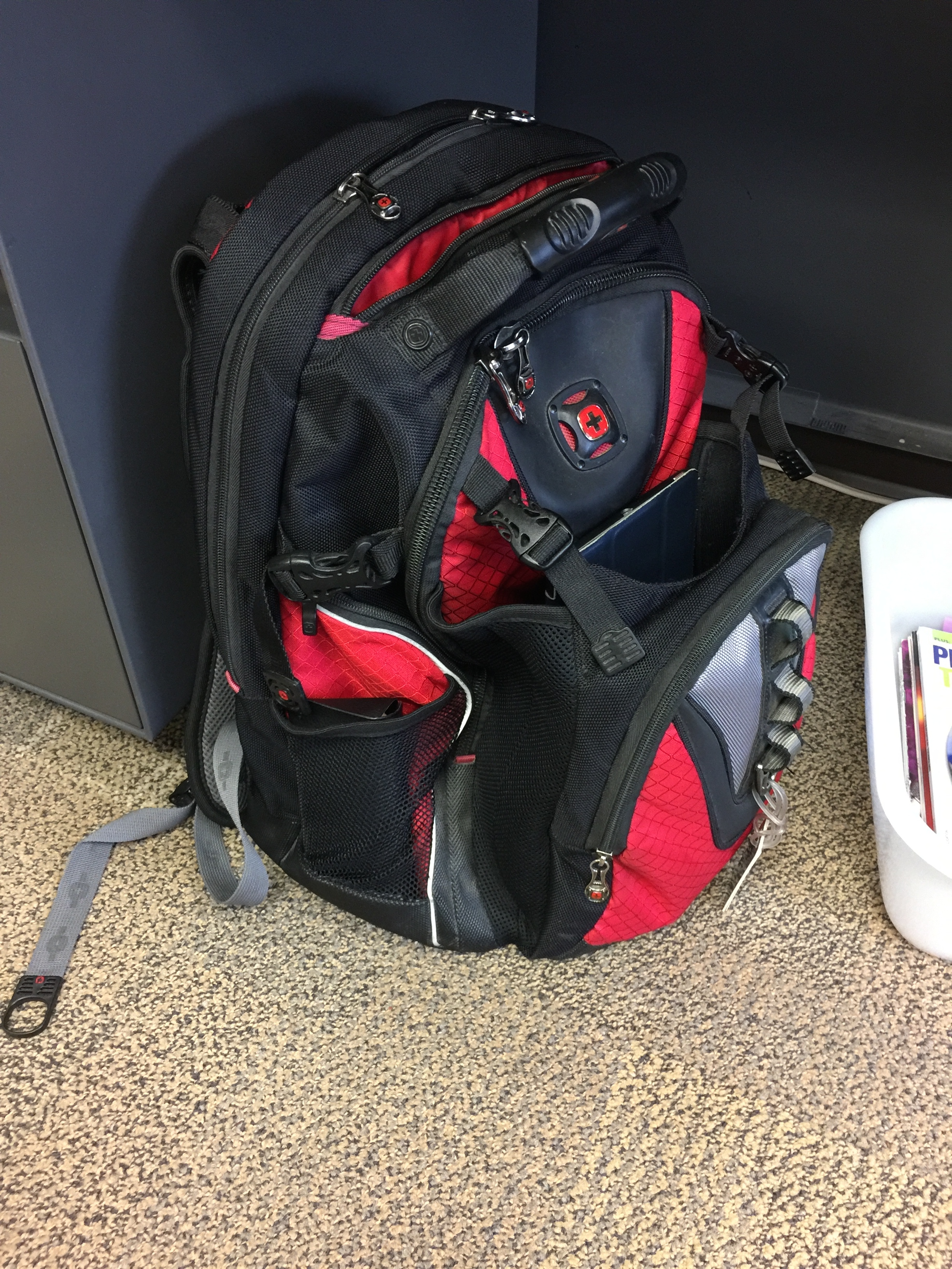 Somehow I knew that my red and black work backpack, which contained my work computer and my personal iPad was also in the roller bag. But when I looked closely at the bag, thinking I needed to take out my backpack before it went off to the incinerator, I could see that there was something beating inside the bag like a human heart.