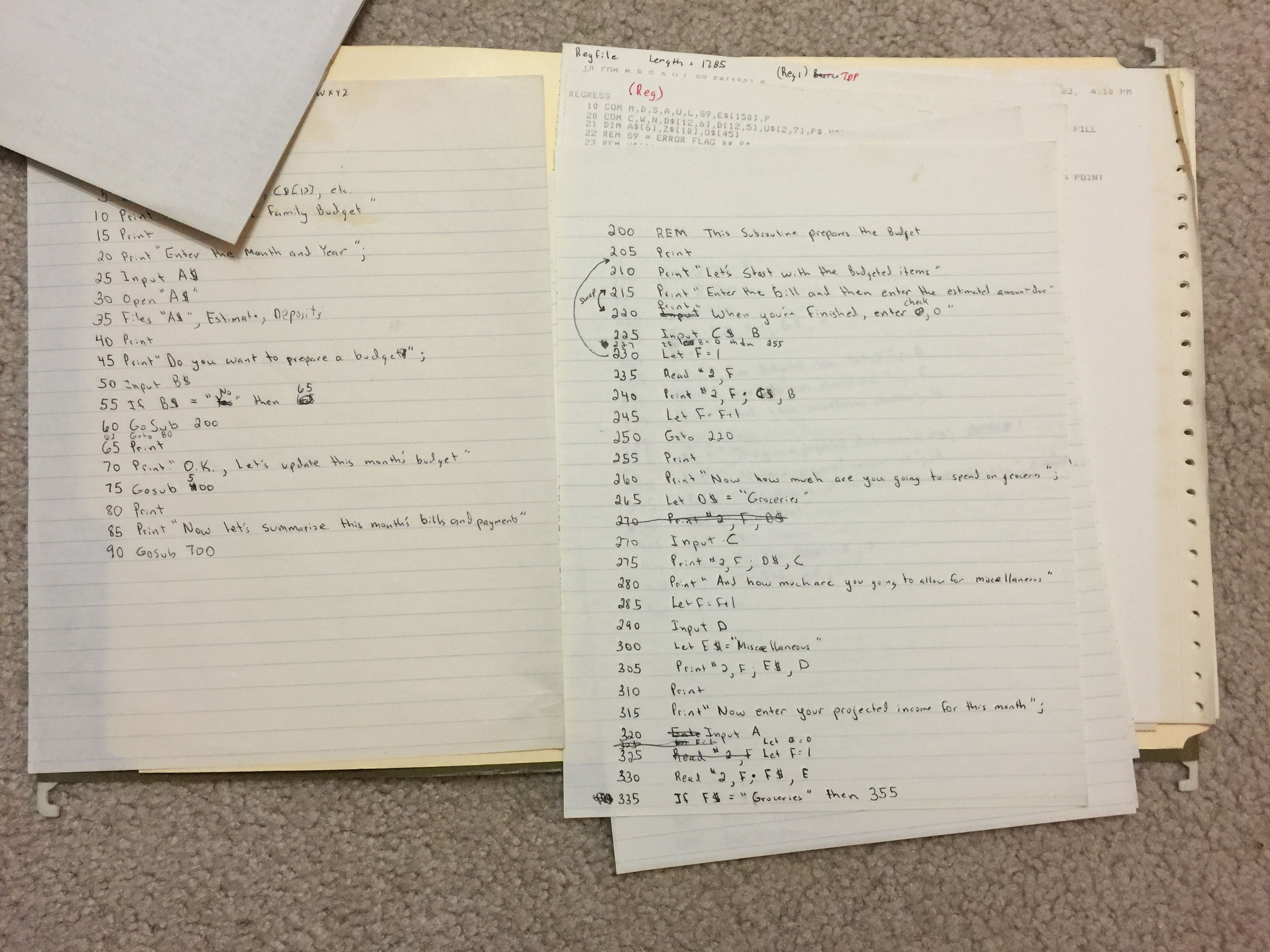As I looked over these 34 year-old documents, I recalled the fun I had had writing these and the sense of pride that on my own, I had taught myself how to successfully program in Basic. It seemed that once I had slayed that old nemesis from college, I was bubbling with confidence to try even more.
