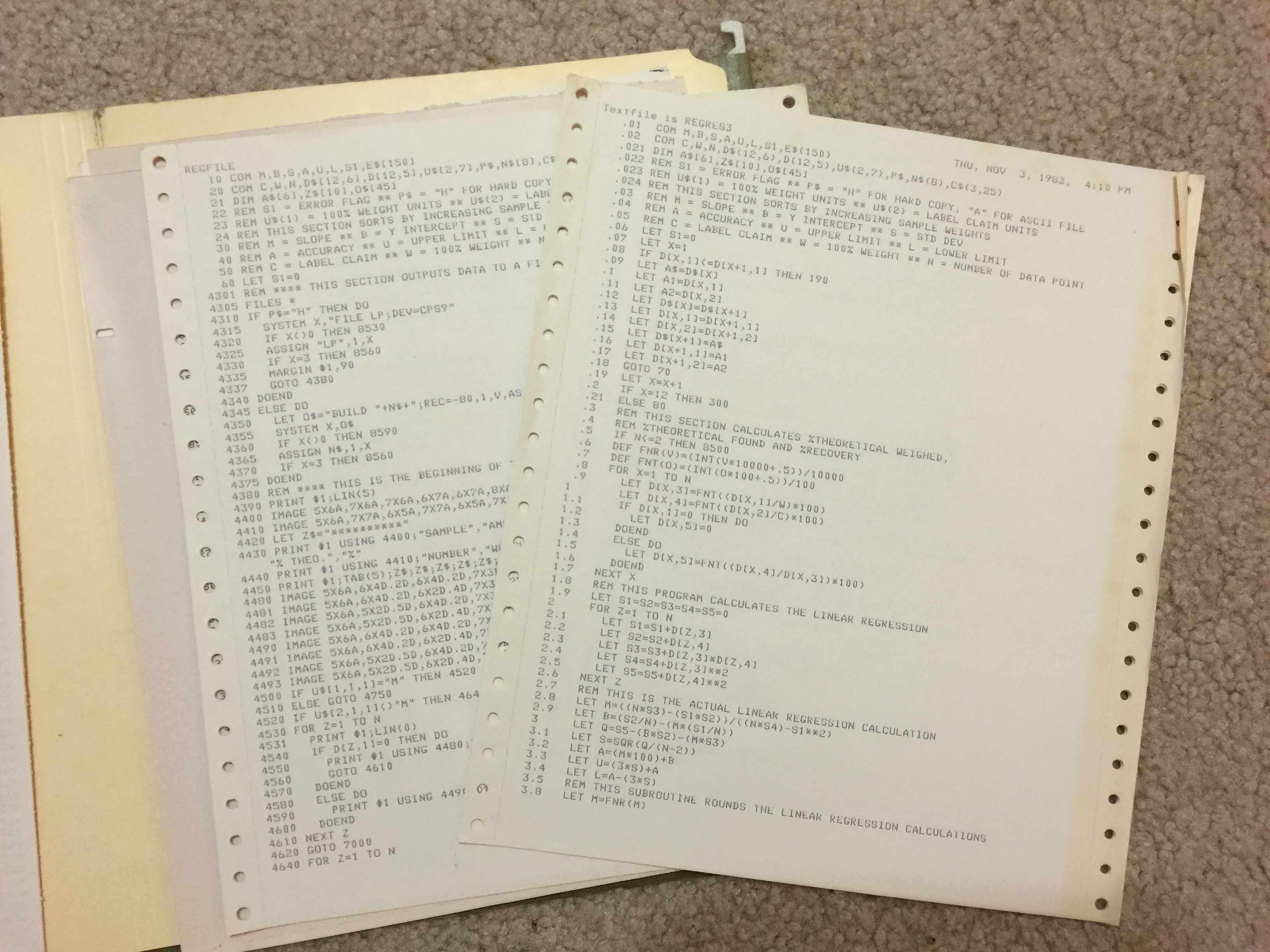 Inside was a Basic computer program I had written to crunch method validation data. My boss, when I first started, was very much into computerization (this was 1982) and challenged me as one of my first special projects to come up with a program to perform these method validation calculations.