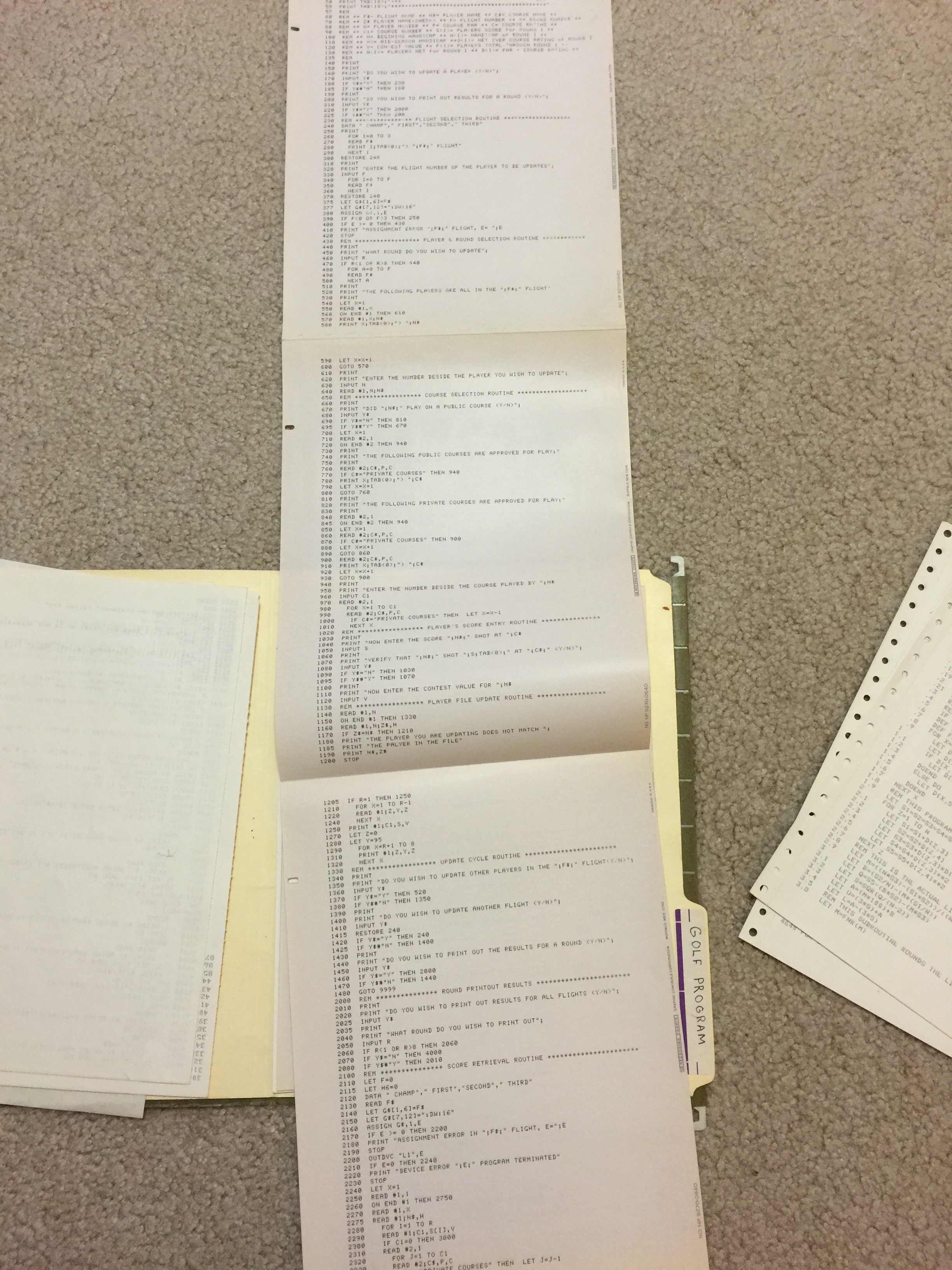 In the same folder, I also found that I had started writing a computer program to manage our family budget. Only problem was this predated the invention of personal computers and so I had no computer of my own on which to run this program. But for a more “legitimate” business use, I did find that I had written a program to track our golf league participant’s scores and total them up to determine the season’s winners. It was almost like that student’s test score program I never was able to write correctly in college, only with golf scores rather than test scores.