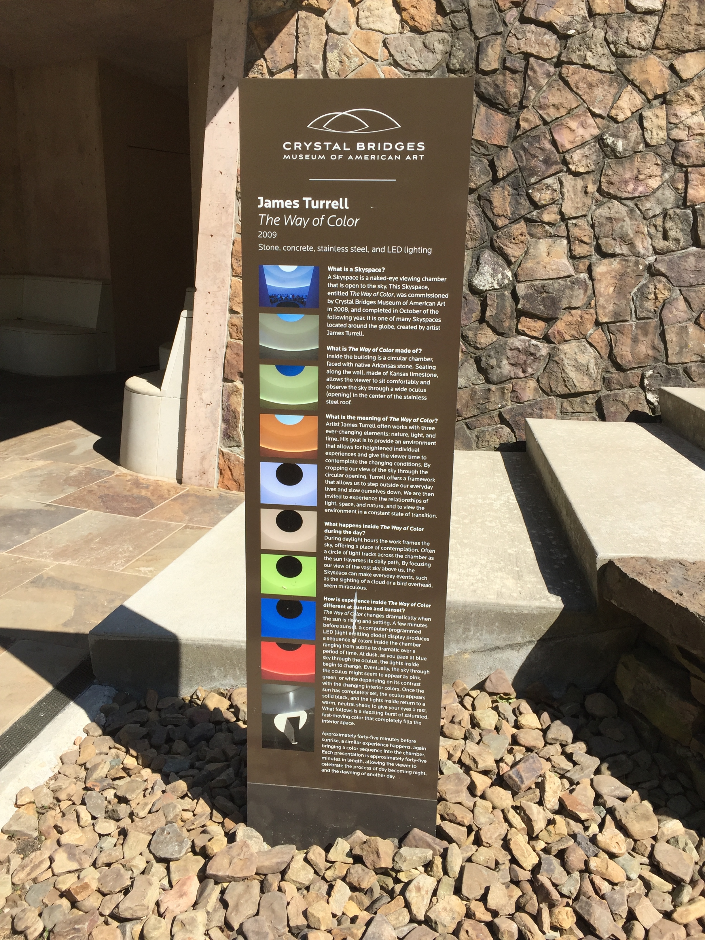 That evening, just before sunset after a fabulous dinner at Press Room, we wandered back over to Crystal Bridges to experience James Turrell’s The Way of Color. This Skyspace is one of several he has created throughout the world where observers experience color as well as your own unique perception of color as dusk turns into night.