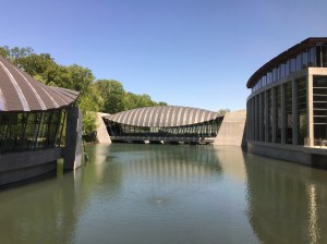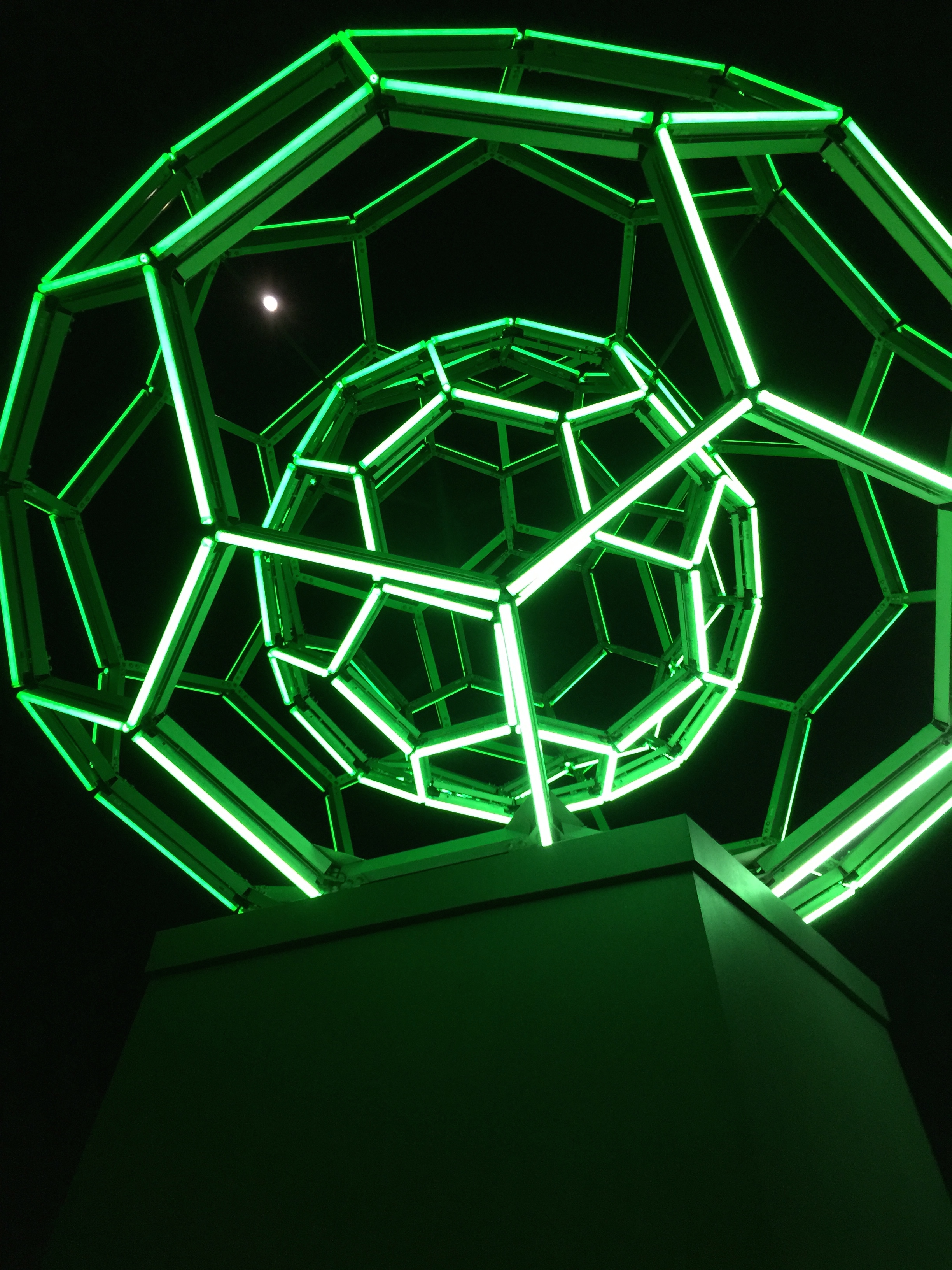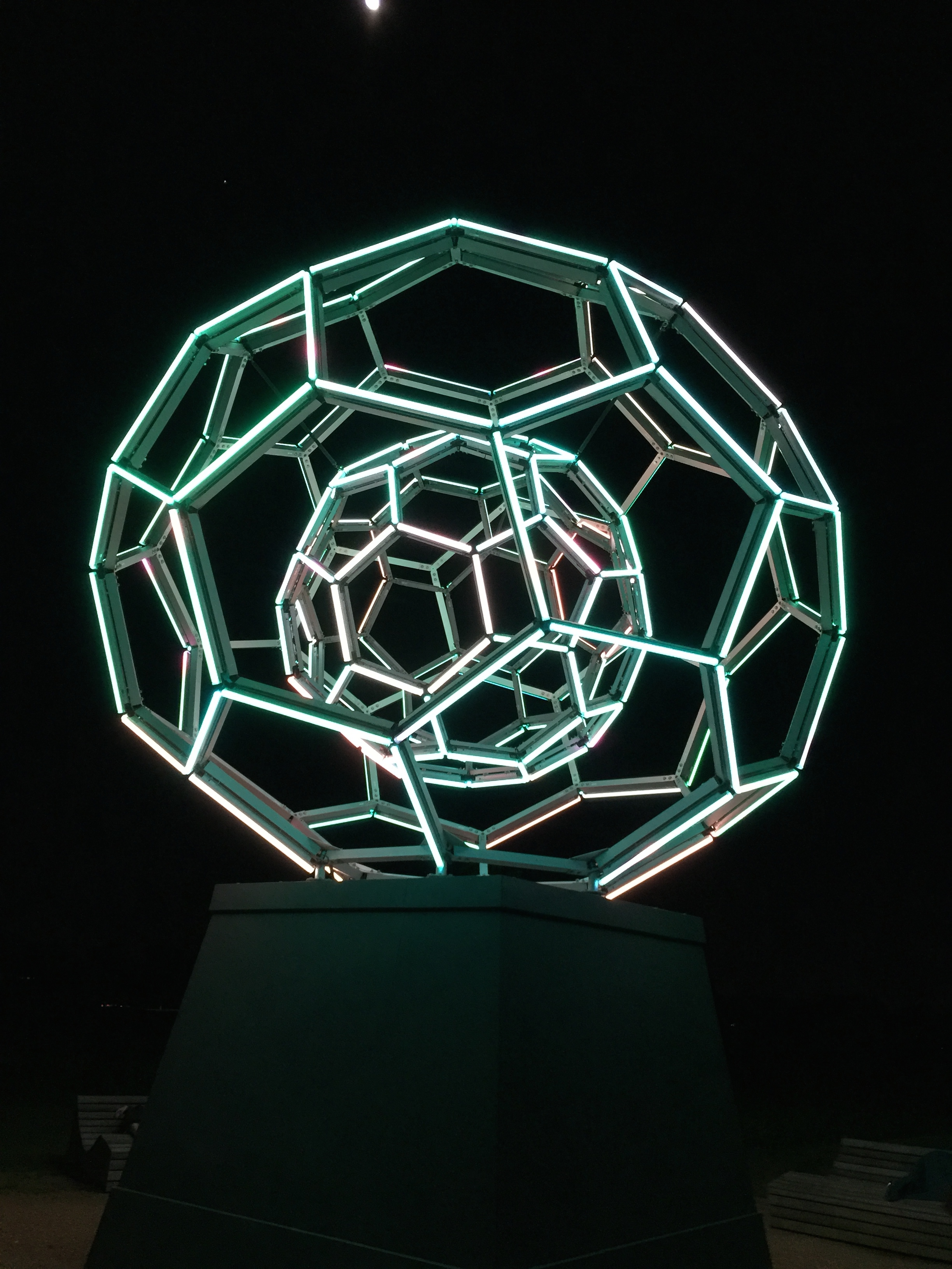 As a nightcap, we made our way over to the front entrance of Crystal Bridges to view Leo Villareal’s LED lighted sculpture Buckyball. Around the base, the museum has provided comfortable wooden chaises upon which to recline and watch the multi-colored light show. I don’t know how long we stayed as the color pattern never repeated it self but it was a wonderful conclusion to an absolutely fabulous day.