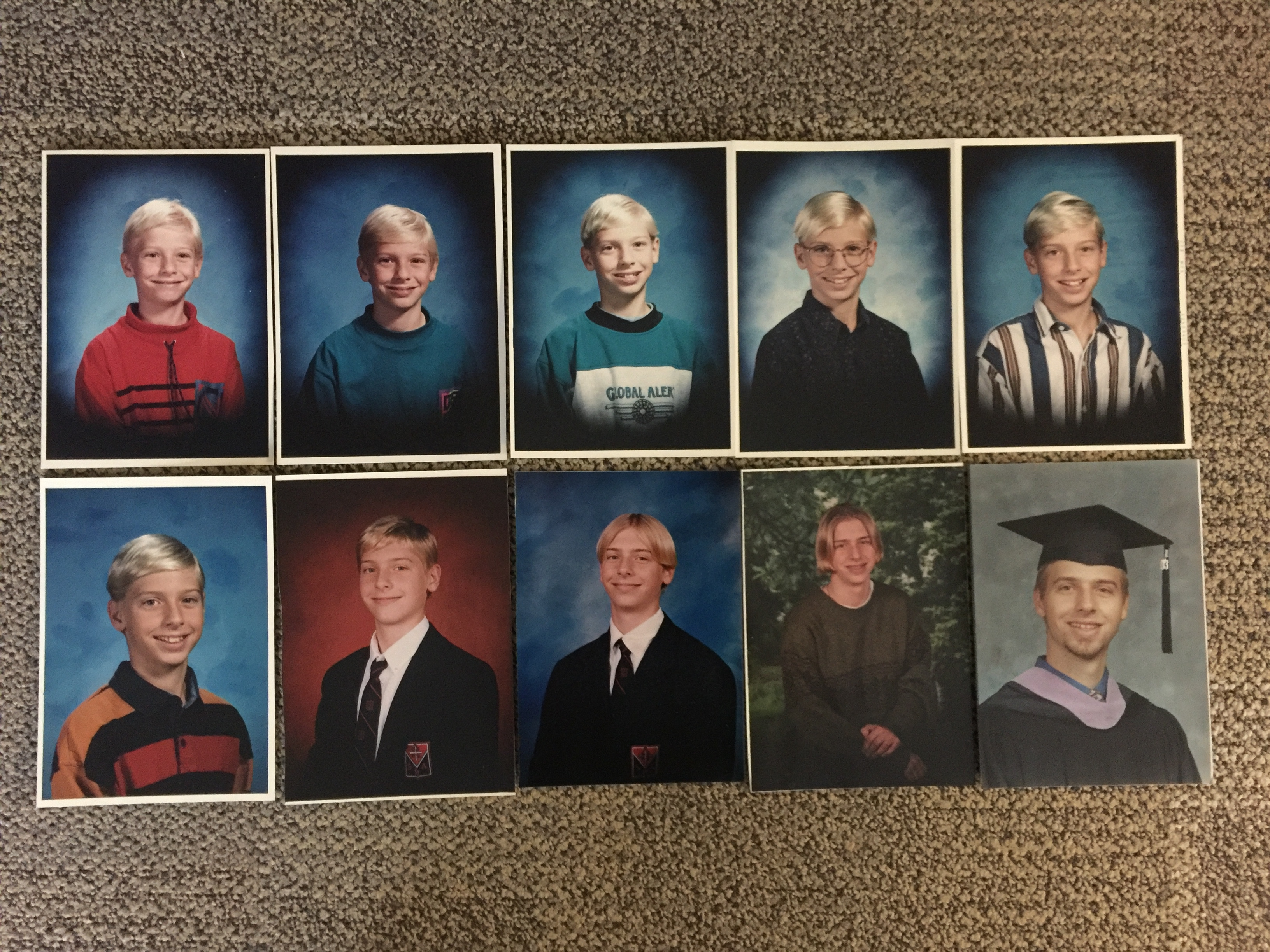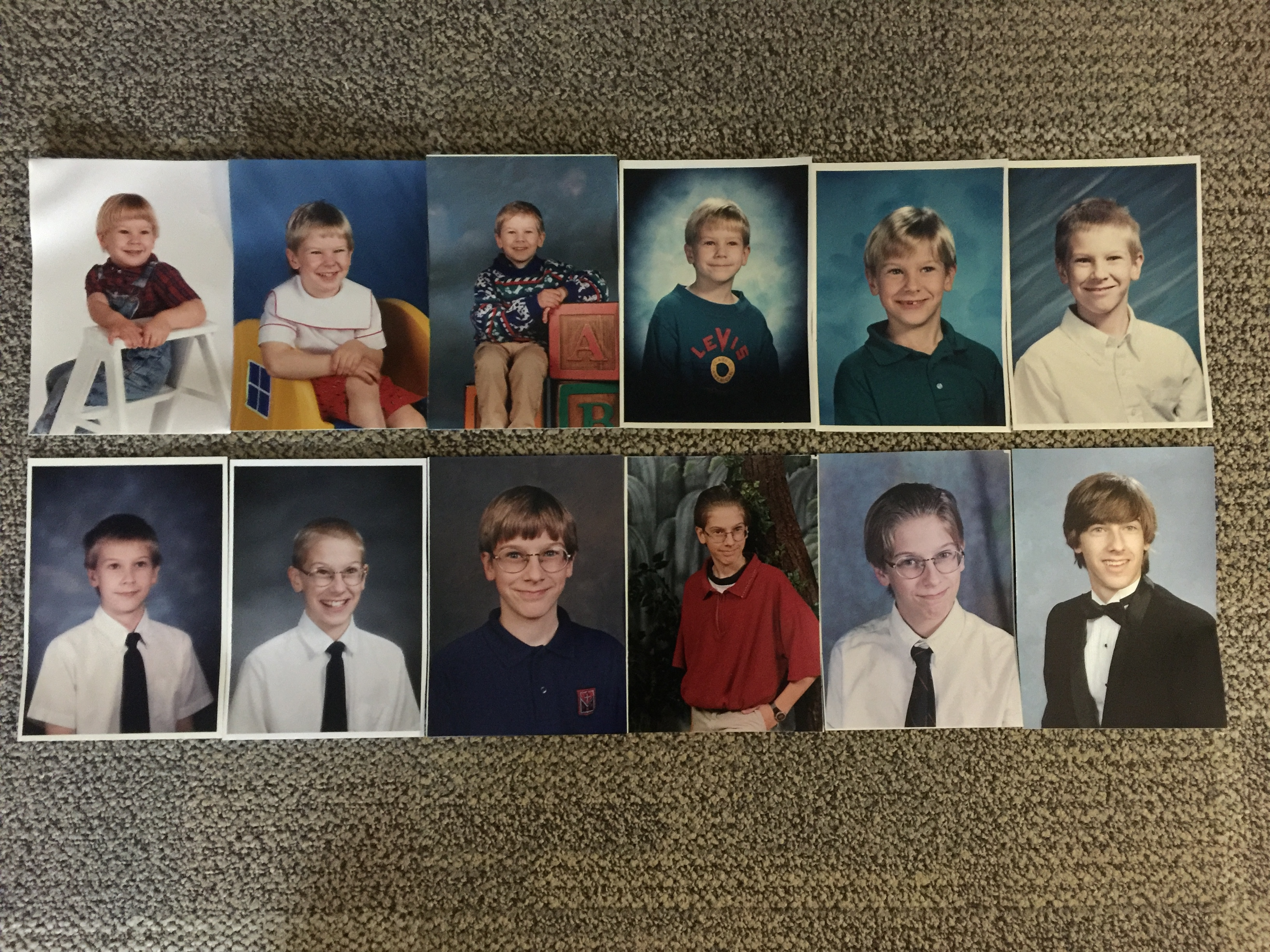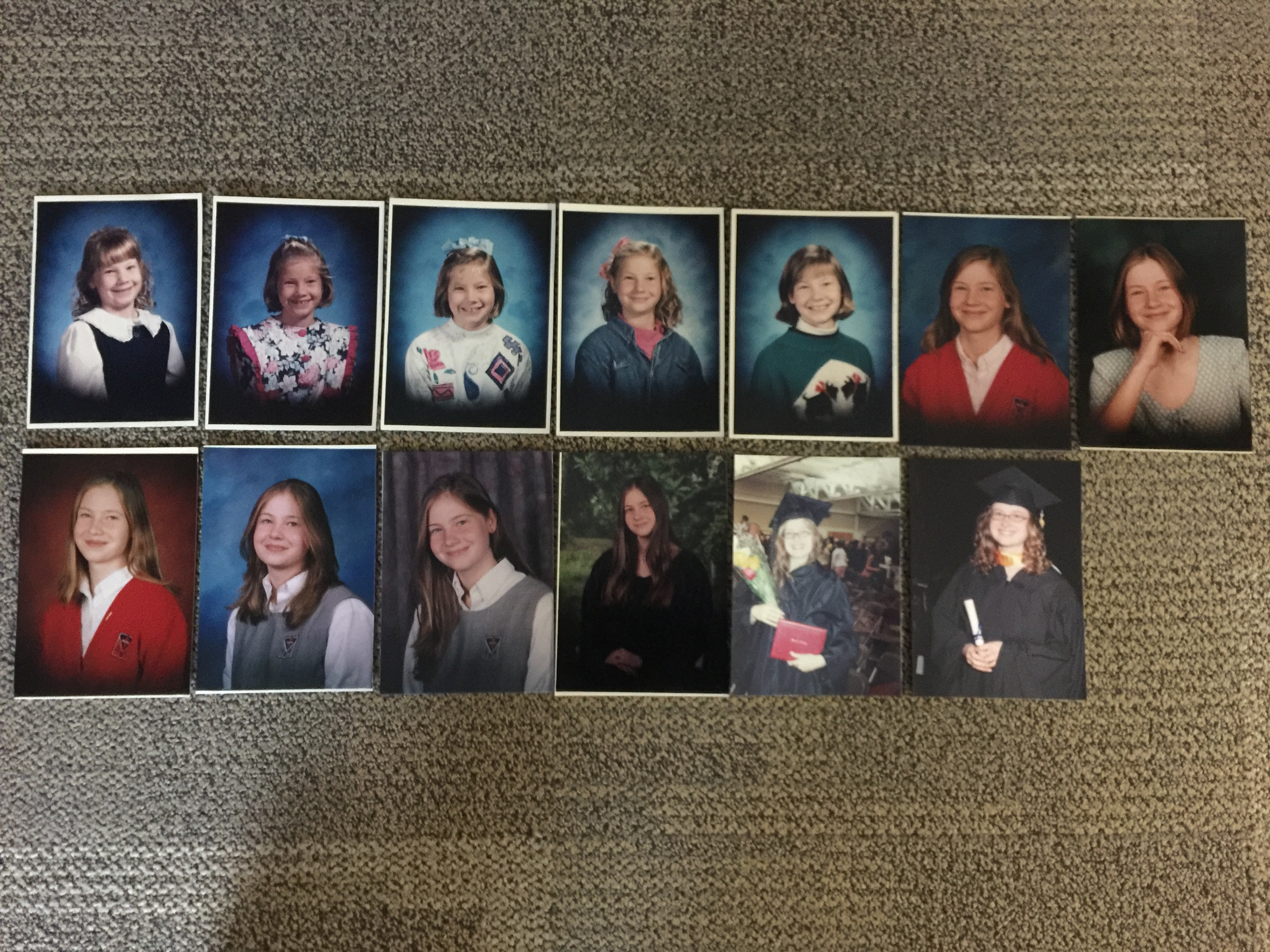 The earliest photos I brought to display on my desk were the ones that were taken when they were in school (or pre-school), the ones taken by a professional photographer in September at the beginning of each academic year. Each fall, they would get a new picture made and I would bring them all to work to replace the previous year’s photo. I have used these same frames all that time so the frames themselves are almost as old as my kids.