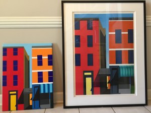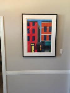 My first attempt at creating art grew from an appreciation for a painting I passed daily at work on my way to the cafeteria. I was drawn to a modern painting of a couple of buildings. Maybe this was a resurfacing of my adolescent love for architecture. I admired the interesting colors and the straight lines and I thought, “I could do that” and I am going to try. I knew aspiring artists often developed their skills painting other artist’s paintings. But I knew I couldn’t sit in the hall at work all day attempting to paint this painting. So I took a digital photo of it and took it home. You can even see a reflection of me in the glass.
