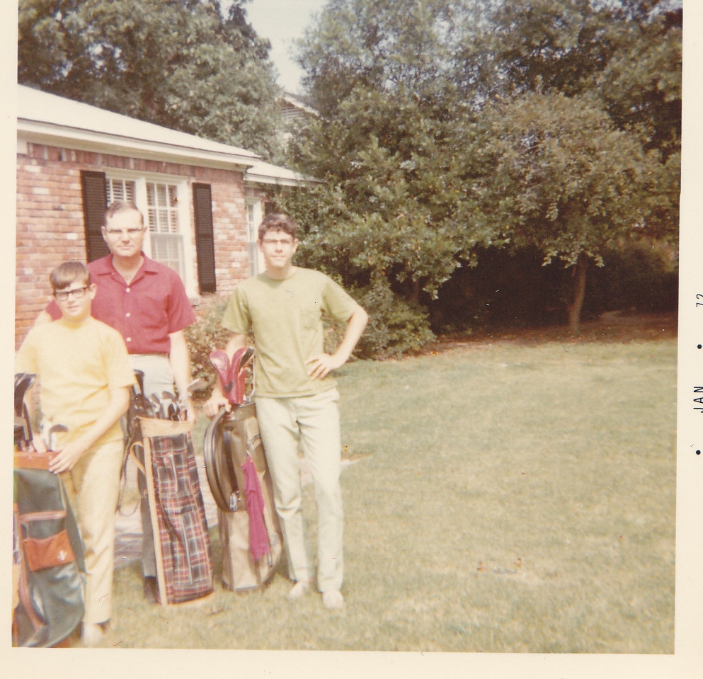 Here is a photo of my brother and I with our dad when we were learning to play golf together. This was one of the “father-son” activities my dad suggested we take up once we had moved to the “big” city with public golf courses available. This was obviously taken after that first outing when we learned that each player was supposed to have his own bag and set of clubs (the first time we golfed, all three of us played out of the bag pictured next to my dad).