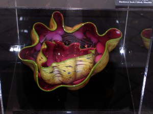 While at the museum, we also got a chance to see a couple of videos of how Chihuly produces his beautiful pieces. If you have ever seen a picture of Dale Chihuly, you will immediately notice that he wears an eye-patch over his left eye, the result of a car accident many years ago. As a result of this injury, he has lost his stereoscopic vison meaning he has diminished depth perception. But in spite of this disability, Chihuly creates his glass art using a team approach with him as the creator and director. In fact, blowing some of the larger pieces literally could not be done without a team.