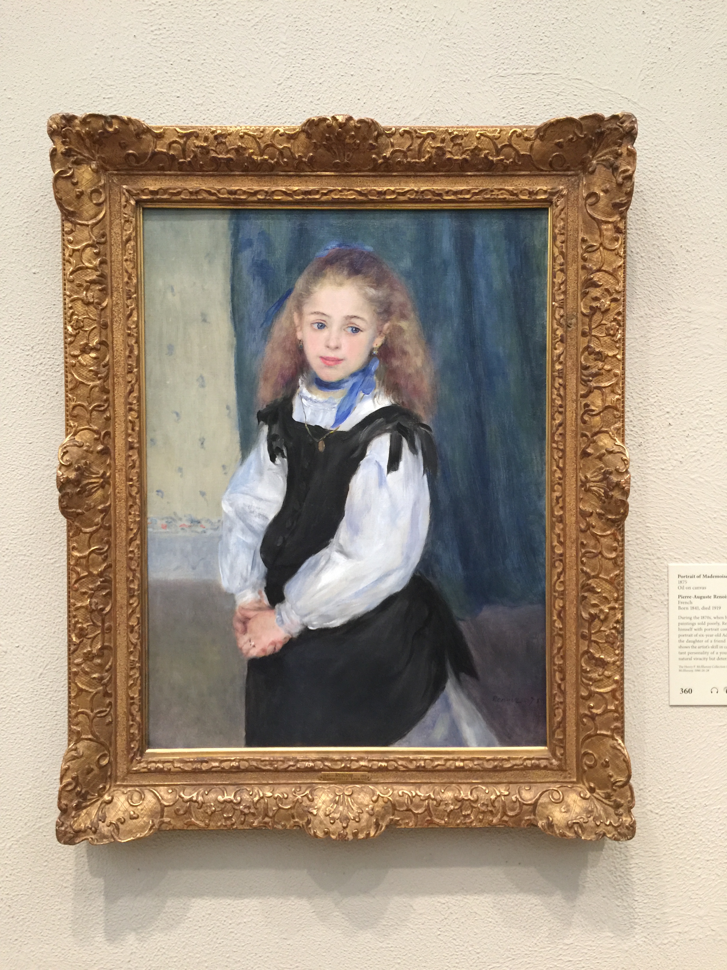 On Sunday afternoon, we went to the Philadelphia Museum of Art, a museum I had not been to in at least 25 years.  I enjoyed getting to see some of my old favorite impressionist artist’s works but the one that I was just smitten by was this Renior, Portrait of Mademoiselle Legrand, a painting I don’t think I had ever seen before.