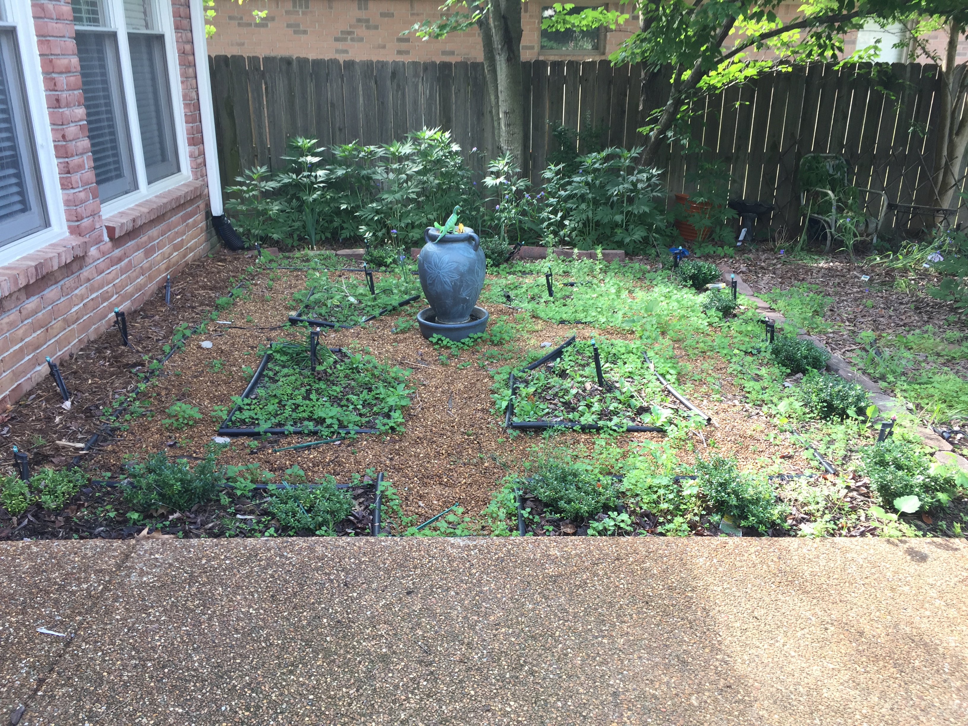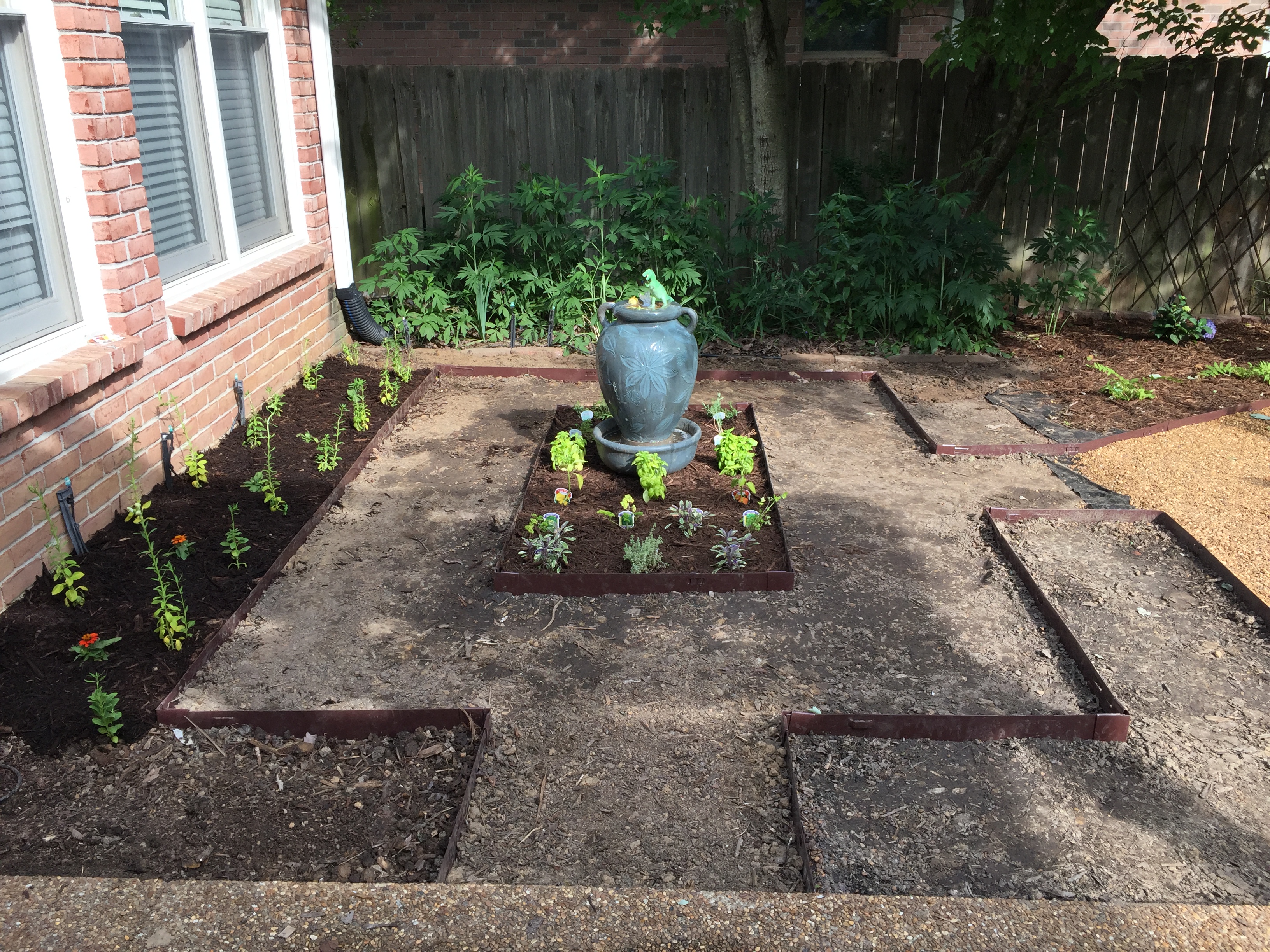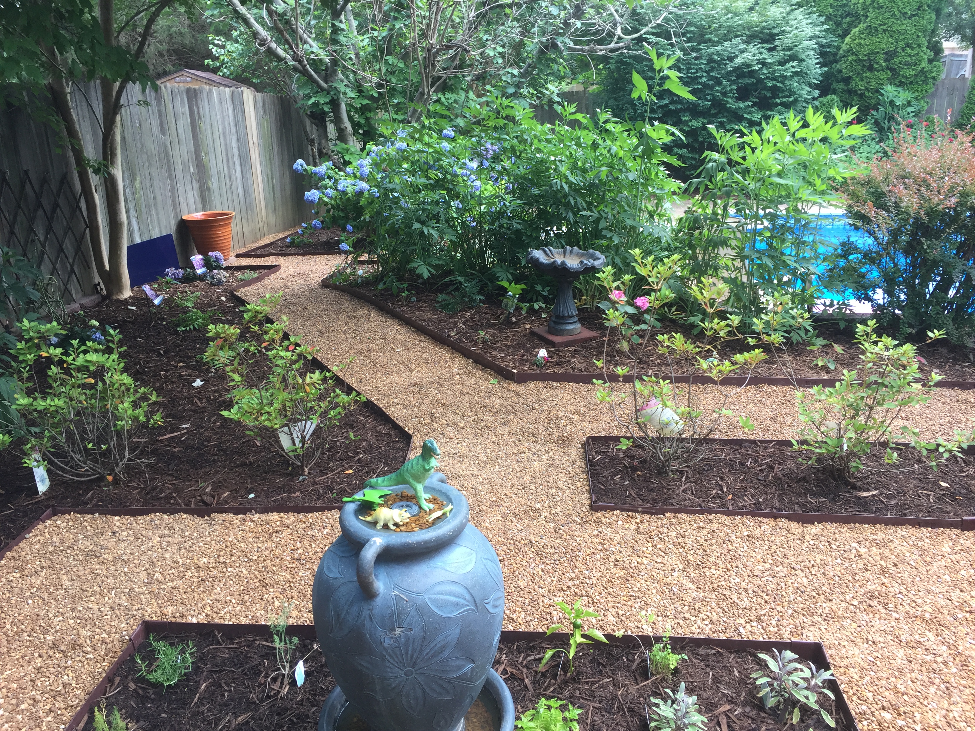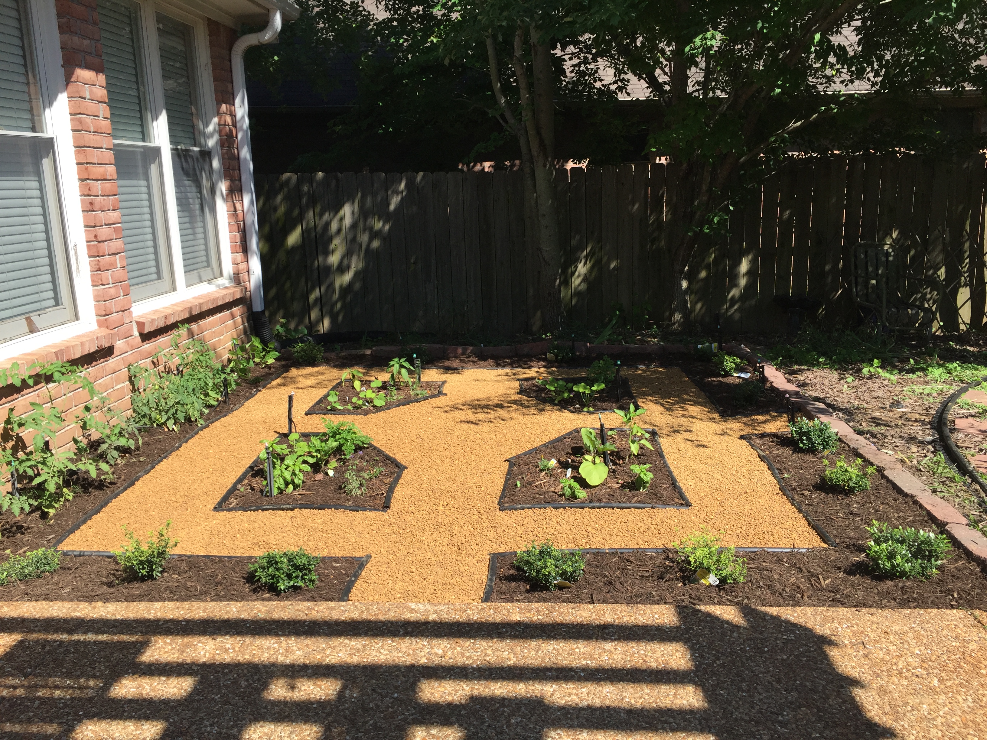 Then in 2016, our oldest son, a landscape architect, came up with this idea to create an interesting space with room for a few garden vegetables and a few fresh herbs. Unfortunately the plastic edging we chose did not provide an adequate barrier to the intermixing of pea gravel and mulch.