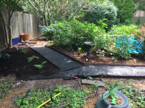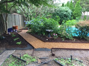 When I started working in this middle bed, in spite of it having quite a “wild look”, it actually turned out to have very few weeds; just several years’ worth of decaying leaves. So clearing it was fairly easy. My wife had previously requested a walkway leading from the upper yard down to her majestic fig tree. I had tried making this in the past by just laying down pea gravel but since the yard slopes significantly here, dirt eventually washed over the pea gravel returning it to a wild state. So my goal was to incorporate a path through this bed, which connected to the upper bed.