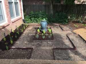 Once I laid out the landscape fabric for the herb garden, my wife placed all 18 of her plants where she wanted them to be planted. Then using scissors, I cut out the shape of the herb container in the fabric and dug the hole for each herb. Planting the herbs was a veritable epicurean delight with the wonderful aromas of the herbs. My mouth practically watered in anticipation of the delicious meals we would have this summer accentuated with such a wide variety of herbs from my wife’s garden.