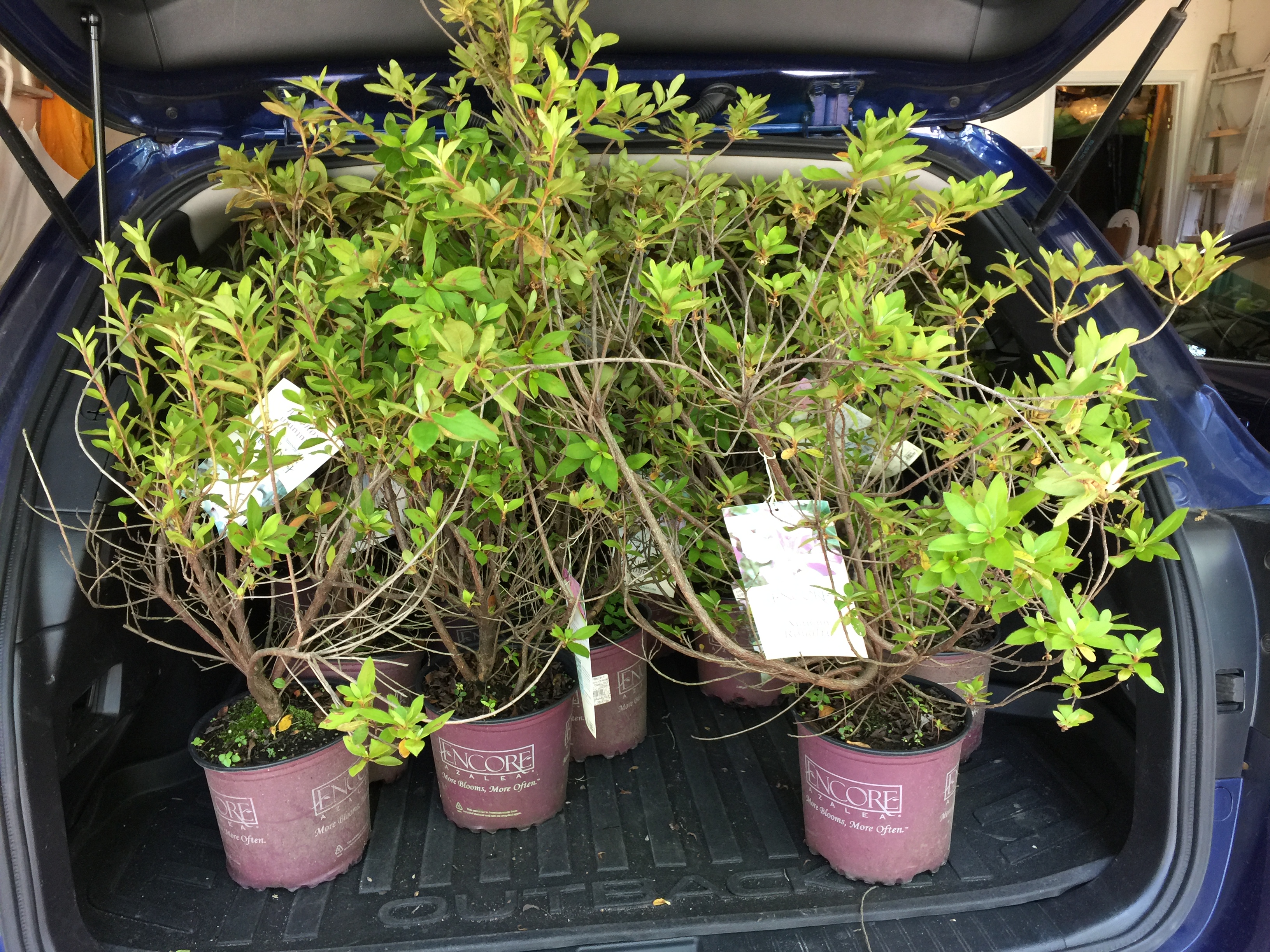 This hybrid variety blooms three times a year so the forest of bushes in the back of my wife’s car should provide us with a forest of color in the garden.